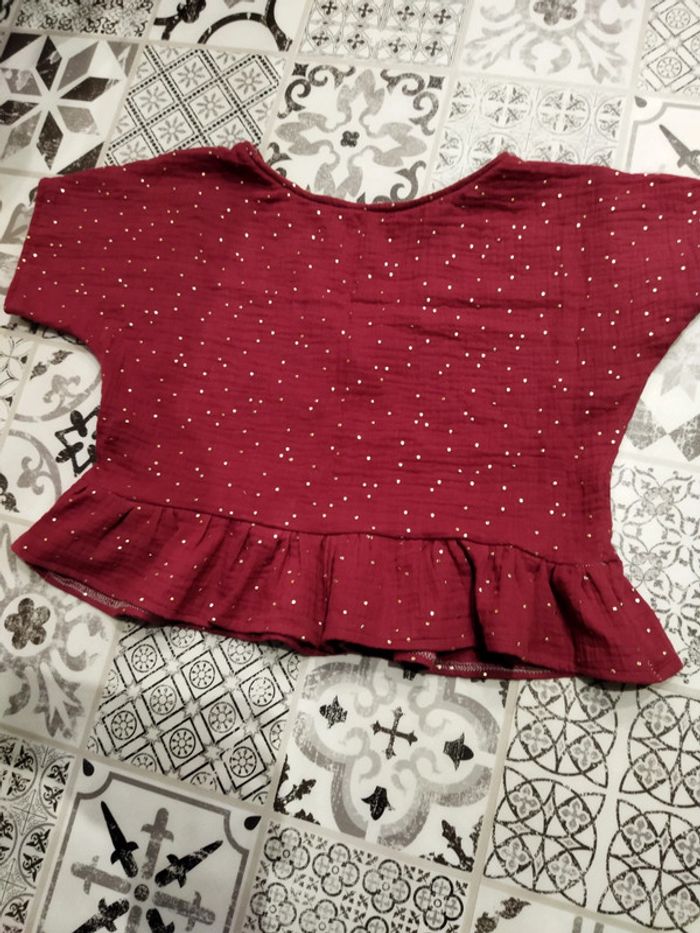 Petit haut court à basque en double gaze de coton neuf Couleur grenat à pois doré. Fait par une créatrice (donc sans étiquette et peu comporter des petites imperfections du travail artisanal) Correspond à un 34 (largeur 41cm à plat). #claireconcours34