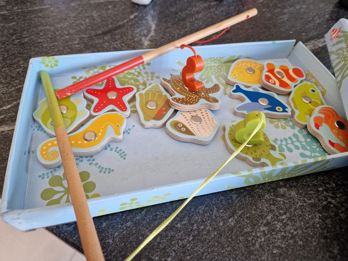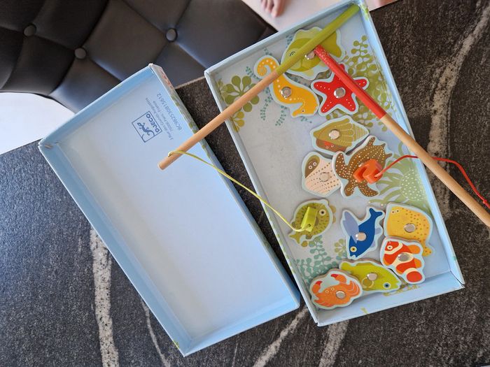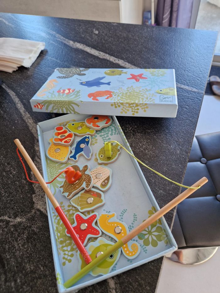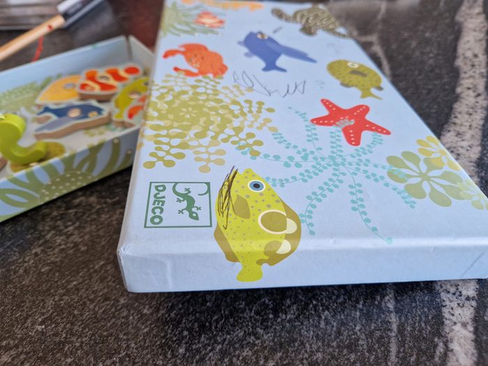 Pêche magnétique Djeco. En carton. Dim de la boîte : L 28,2 x l 15,8 x H 2,8 cm. Dim. d'un poisson : L 5,8 x l 0,4 x H 4,8 cm. Longueur d'une canne à pêche : 22,5 cm. 12 éléments et 2 cannes à pêche.