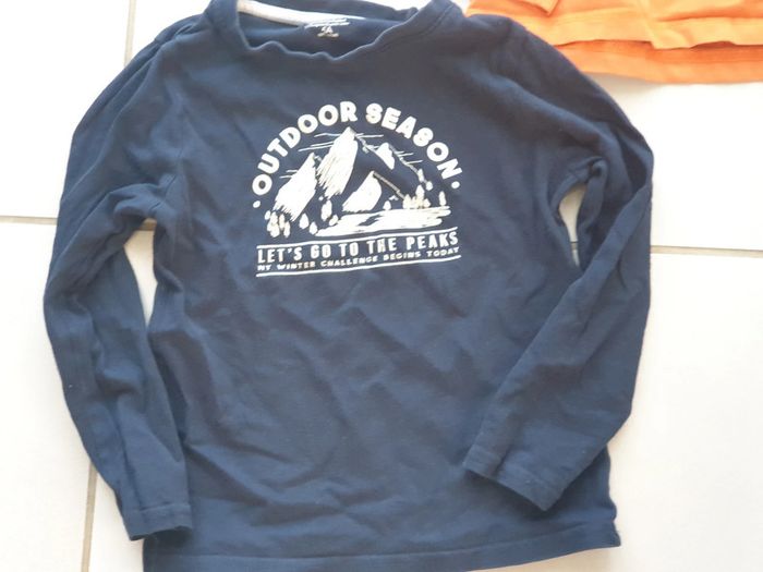 3 t-shirts manche longue 5 ans n°2 : - 1 T- SHIRTS Manche Longue orange marqueYCC214 5 ANS (des petites taches, voir photo) en cadeau - 1 T- SHIRTS Manche Longue rayures GRIS et blanc marque KIABI 5 ANS 108-113 CM avec image dinosaure - 1 T- SHIRTS Manche Longue bleu marine marque KIABI 5 ANS 108-113 CM avec image montagne #laetie69_taille5ans