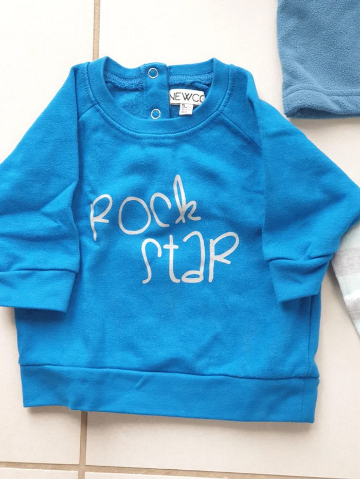 1 pull bleu 3 boutons dans le dos marque newco 9 mois image ROCK STAR 1 pull bleu zip devant en haut marque PIK OUIC 9 mois 1 pull rayures vert gris 3 boutons sur le coté devant marque TE 9 mois #laetie69_taille9mois