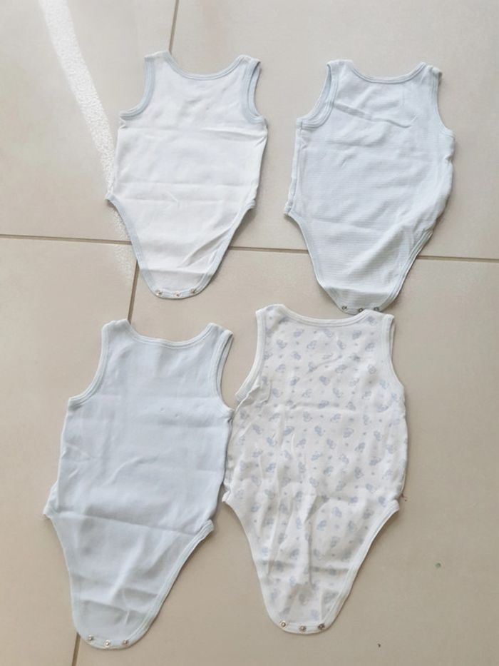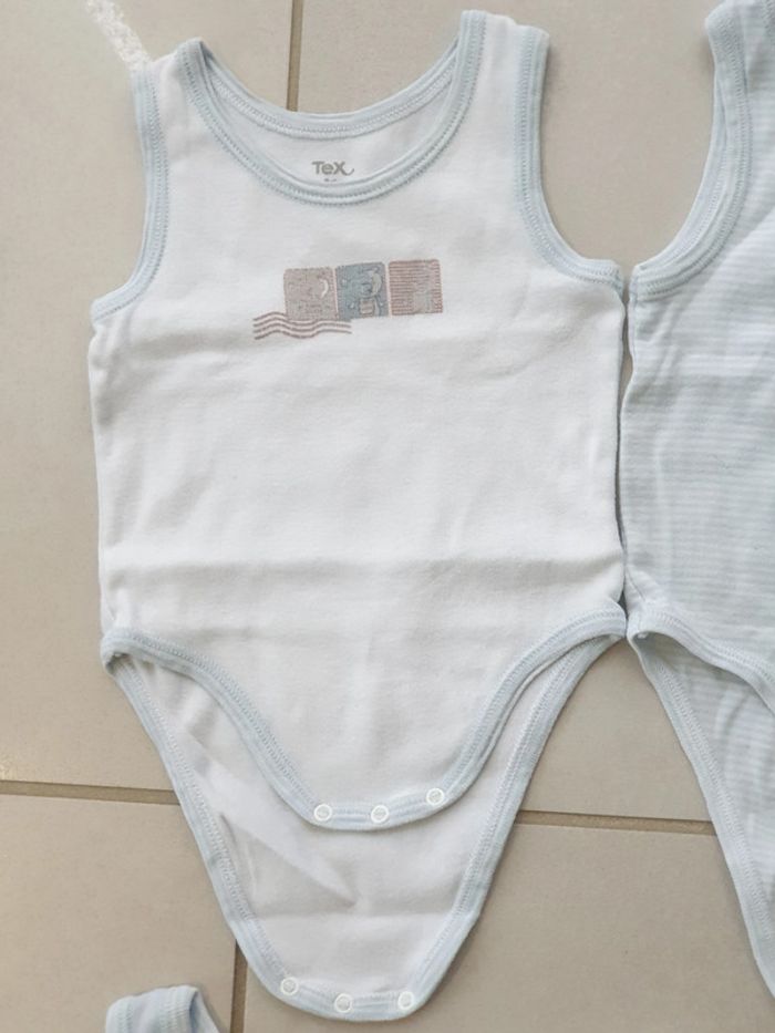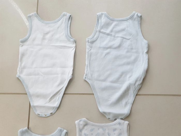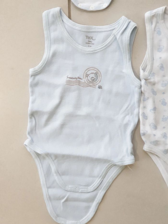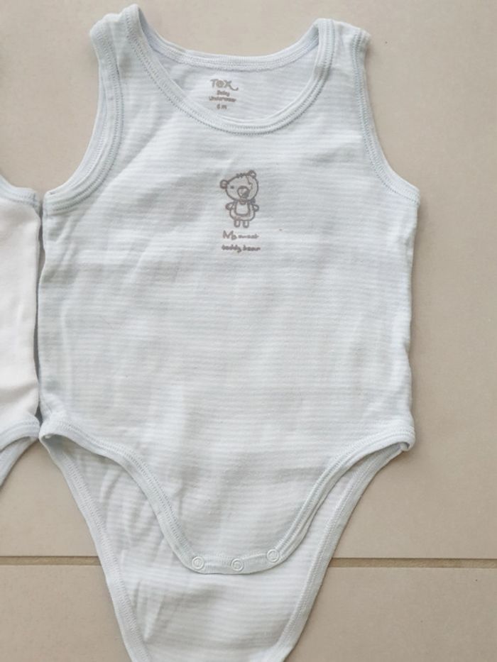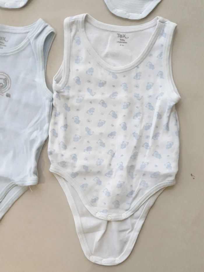 1 bodies sans Manche bleu taille 6 mois marque tex 1 bodies sans Manche blanc contour bleu ciel taille 6 mois marque tex 1 bodies sans Manche blanc et rayures bleu taille 6 mois marque tex 1 bodies sans Manche blanc avec image oursons taille 6 mois marque tex #laetie69_taille6mois