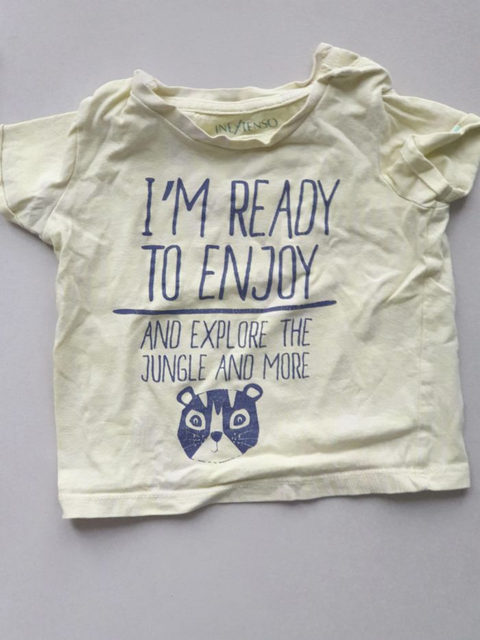 1 t-shirts orange MC 12 mois marque TISSAIA marqué le marché du village TANGALI (2 boutons sur le coté du cou) 1 t-shirts MC jaune marque inextenso image tete lion I'M READY TO ENJOY 74 CM (1 bouton sur le coté du cou) #laetie69_taille12mois