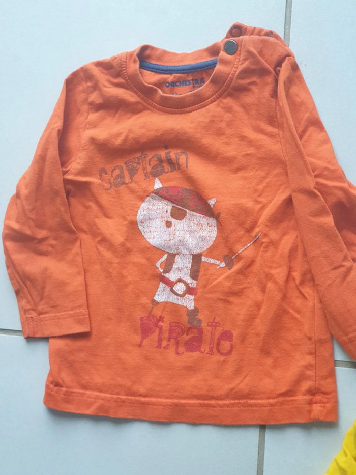 1 T- SHIRTS Manche Longue orange avec image capitaine pirate marque ORCHESTRA 12 mois 74 cm 2 boutons sur le coté vers le cou 1 T- SHIRTS Manche Longue BLEU RAYURES BLANC marque OBAIBI 12 mois 74 cm 1 bouton de chaque coté vers le cou 1 T- SHIRTS Manche Longue jaune avec image image ours marque grain de blé 12 mois 2 boutons sur le coté vers le cou #laetie69_taille12mois