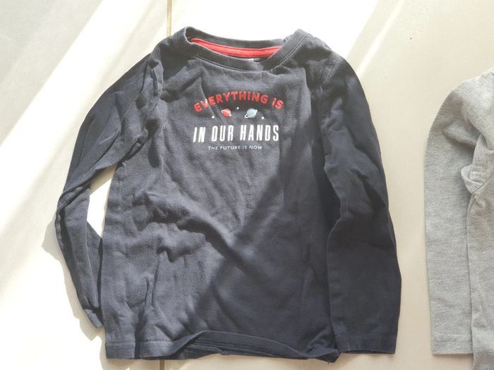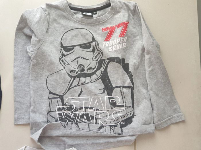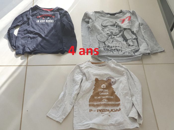 3 t-shirt manche longue n °2 : 1 t-shirt manche longue bleu avec planètes et écritures marque kiabi taille 4 ans 98-107 cm 1 t-shirt manche longue gris avec image star wars marque star wars taille 4 ans 102 cm 1 t-shirt manche longue gris avec image ours marron marque patauguas taille 4 ans #laetie69_taille4ans