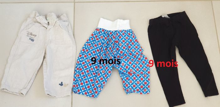 1 legging noir 9 mois 71 cm marque barbouillage 1 pantalon écru beige marque Disney 9 mois 1 pantalon décoré bleu rouge 9 mois env tres bon etat #laetie69_taille9mois #garcon #taille9mois #pantalon #legging