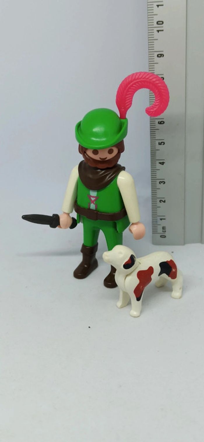 Homme chasseur moyen age avec habits verts et chien de chasse à courre playmobil