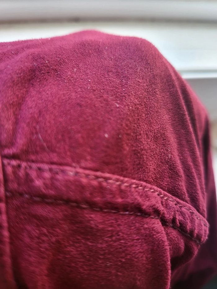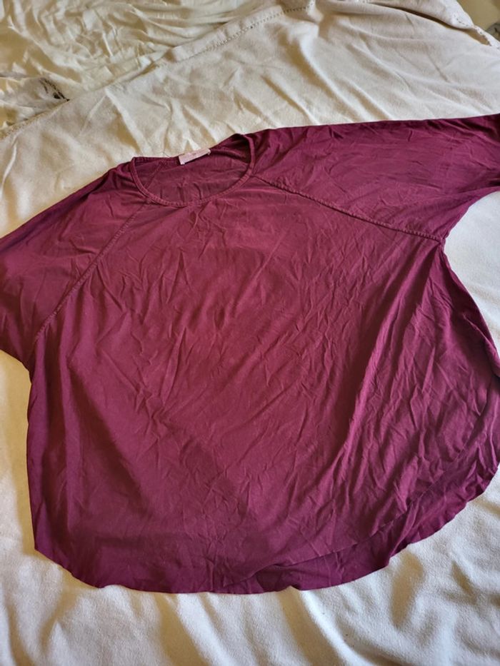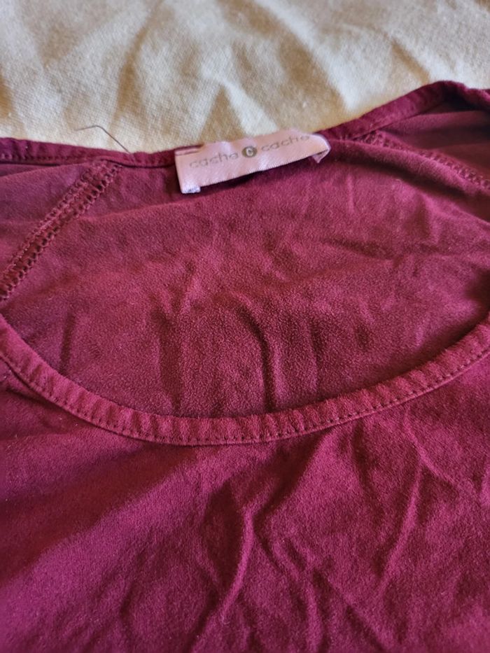 Haut cache cache Couleur bordeaux / violine Matière effet peau de pêche très agréable et léger Bas arrondi Revers au niveau des manches Environ t38/40