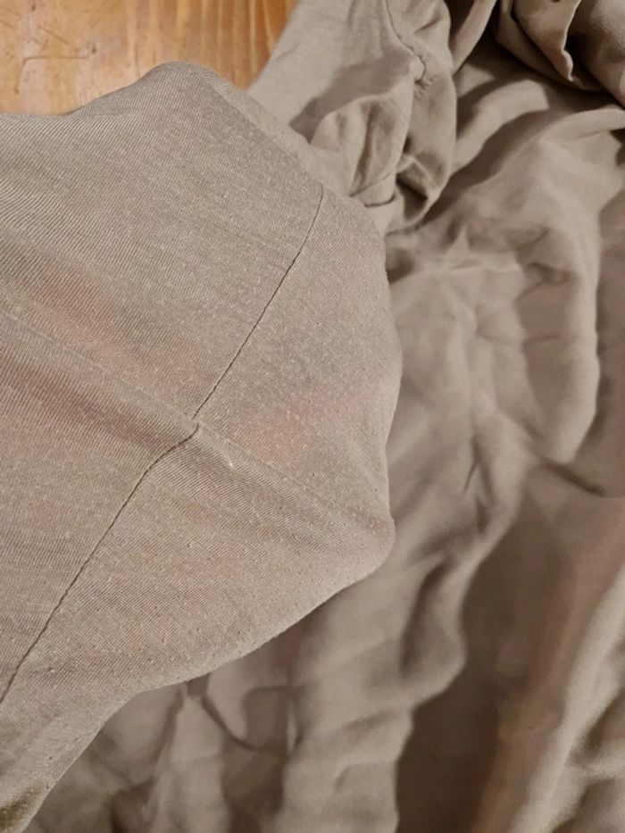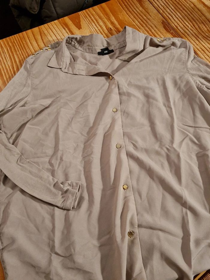 H&M T L Couleur taupe "Strass" sur épaules majoritairement partis Corps effet satiné Manches matière tee shirt léger 100 % polyestere Bon etat Seul bémol : odeur de stockage cave