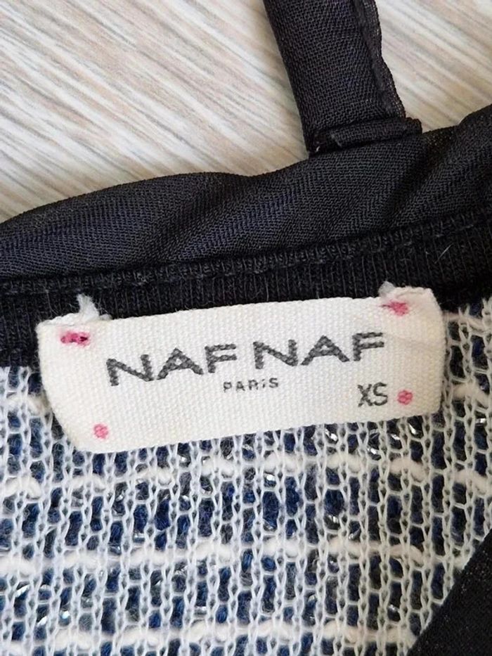 Joli pull pailleté avec fibre métallique XS Naf Naf bleu noir et blanc A signaler : un tout petit accroc au niveau du décolleté qui se voit très peu Se noue derrière le cou #julilo7femme