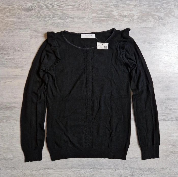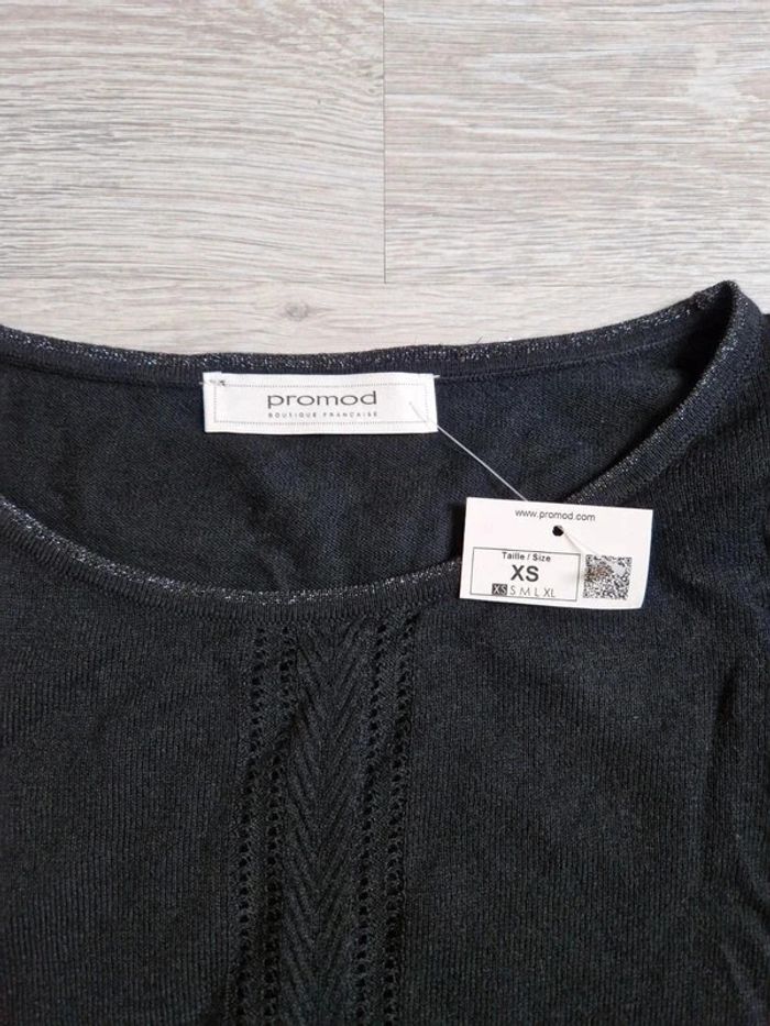 Pull fin Promod XS Neuf avec étiquette #julilo7femme Col argenté et volant sur les épaules Bande ajourée sur le milieu Largeur au niveau des coutures d'épaule : environ 31 cm Longueur totale : environ 58 cm