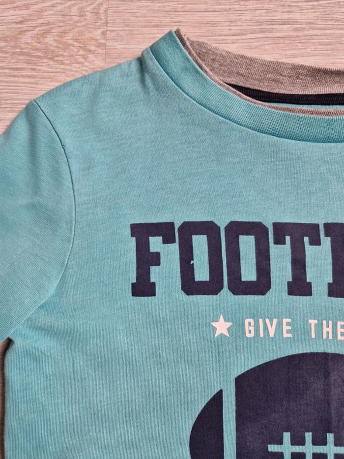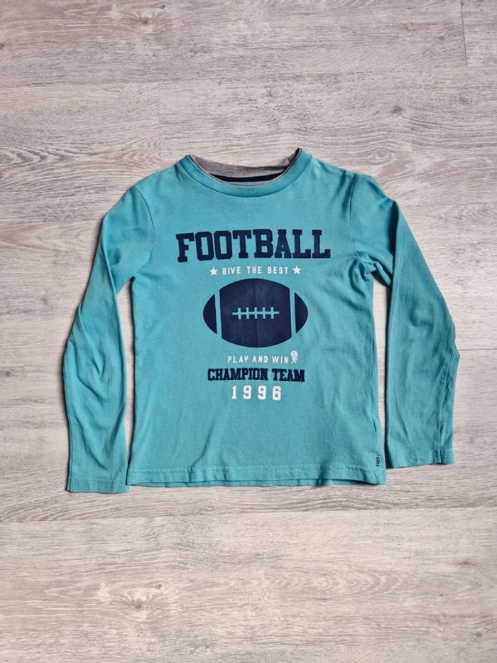 Tee-shirt manches longues Okaïdi 8 ans Motif football A signaler : un tout petit trou sur le haut d'une manches et une des lettres O très légèrement abîmée #julilogarçon8ans
