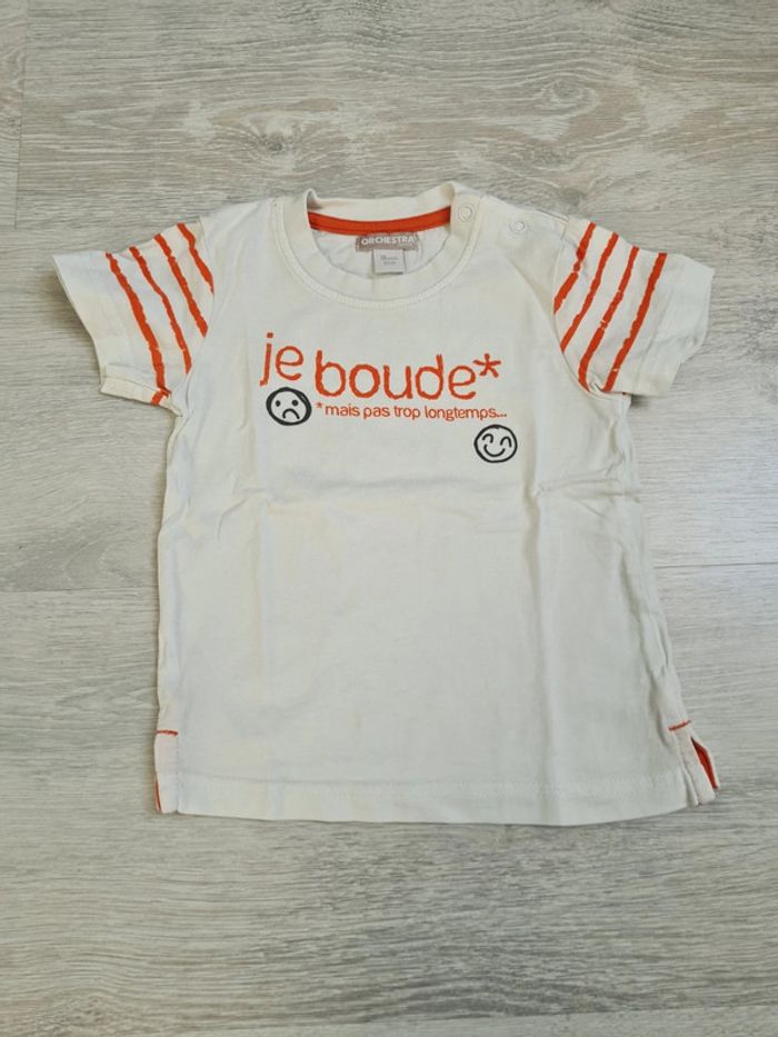 Tee-shirt manches courtes Orchestra Taille 18 mois mais taille très petit : je le conseille pour un 12 mois Inscription "Je boude mais pas trop longtemps" #julilo7garçon12mois