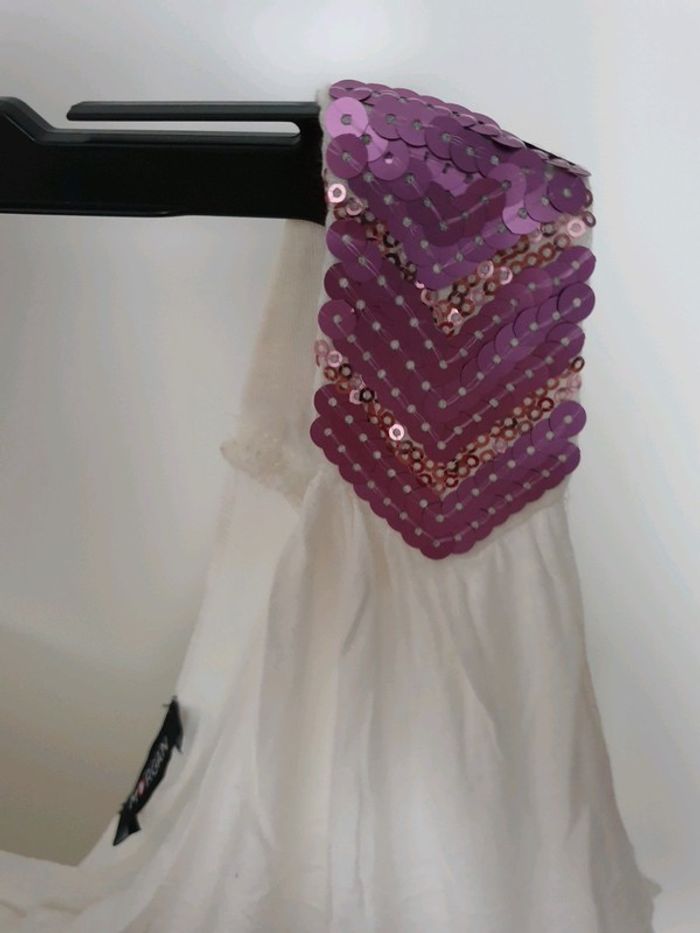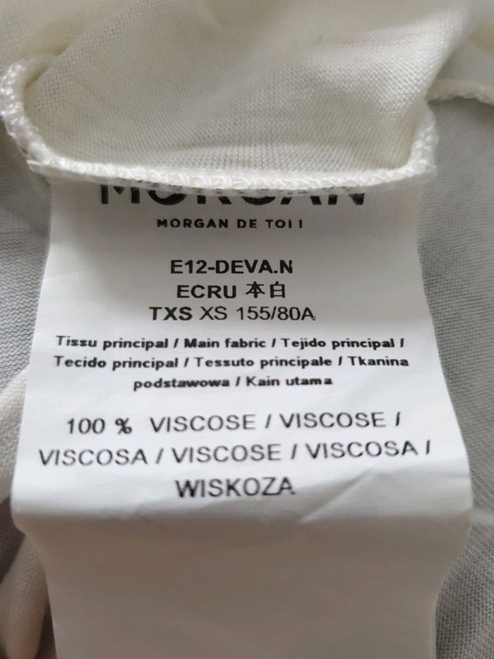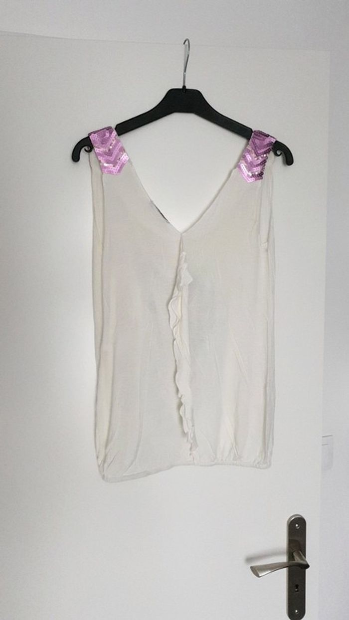 Top Morgan Taille XS Écru avec fleurs tropicales et petits strass Elastiqué à la taille et sequins sur les épaules Petit volant au milieu du dos Porté une fois : excellent état Dimensions mesurées à plat - longueur totale : environ 64 cm - largeur poitrine : environ 45 cm Remise en main propre possible dans l'Essonne #julilo7femme