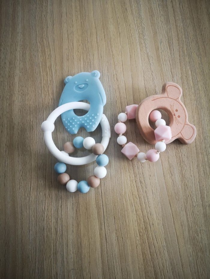 Deux anneaux de dentition en silicone et le rose silicone et bois, comme neufs jamais servis #justine180814_bebe