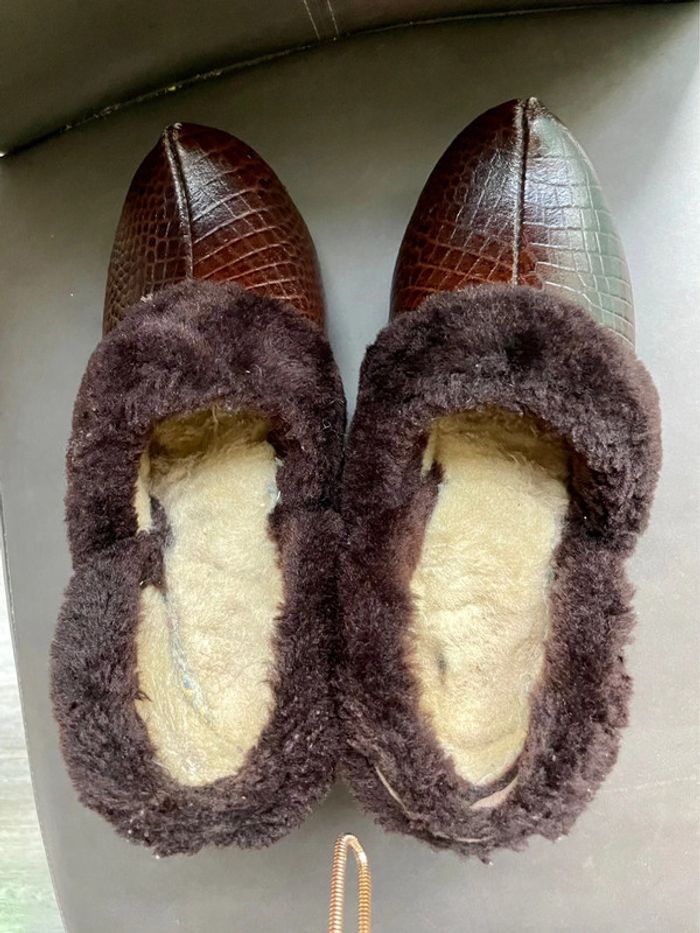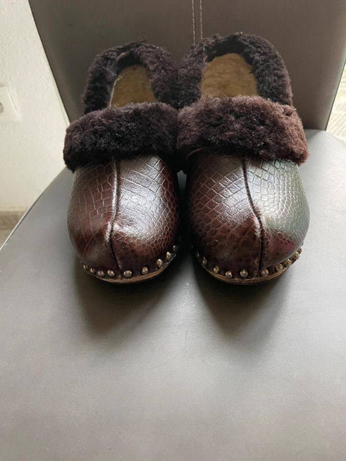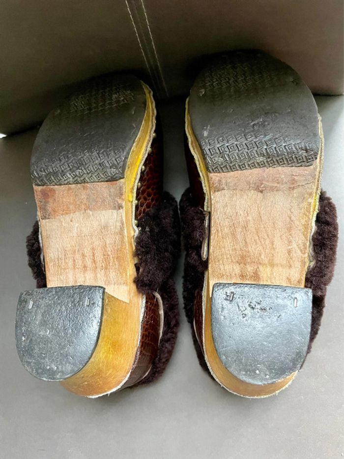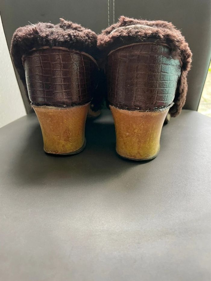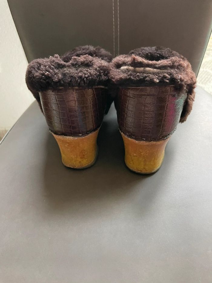 Sabots vintages en cuir crocodile. Intérieur en laine de mouton. Talon et bas de la chaussure en bois. Pointure pour un petit 38, ou 37. Légèrement dévêtu de laine au niveau du talon droit mais ne se voit presque pas P3