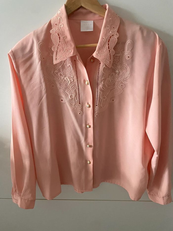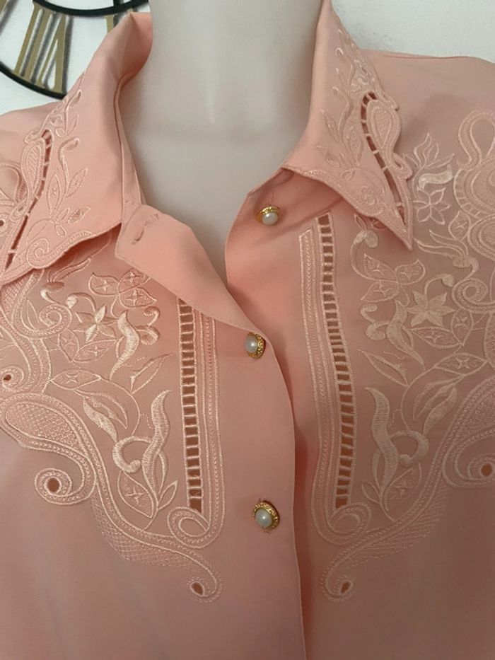 Très bonne état Style vintage broderie et jolies boutons Couleur rose saumon Mesure aisselle à aisselle 60 cm Mesures épaules 48 cm Longueur 65 cm Petites épaulettes P6