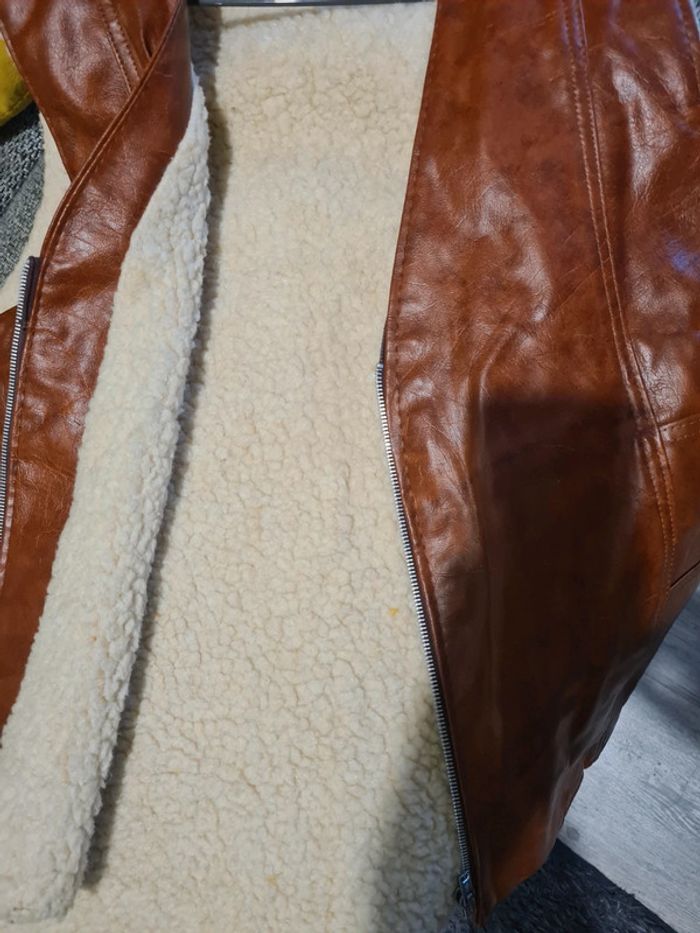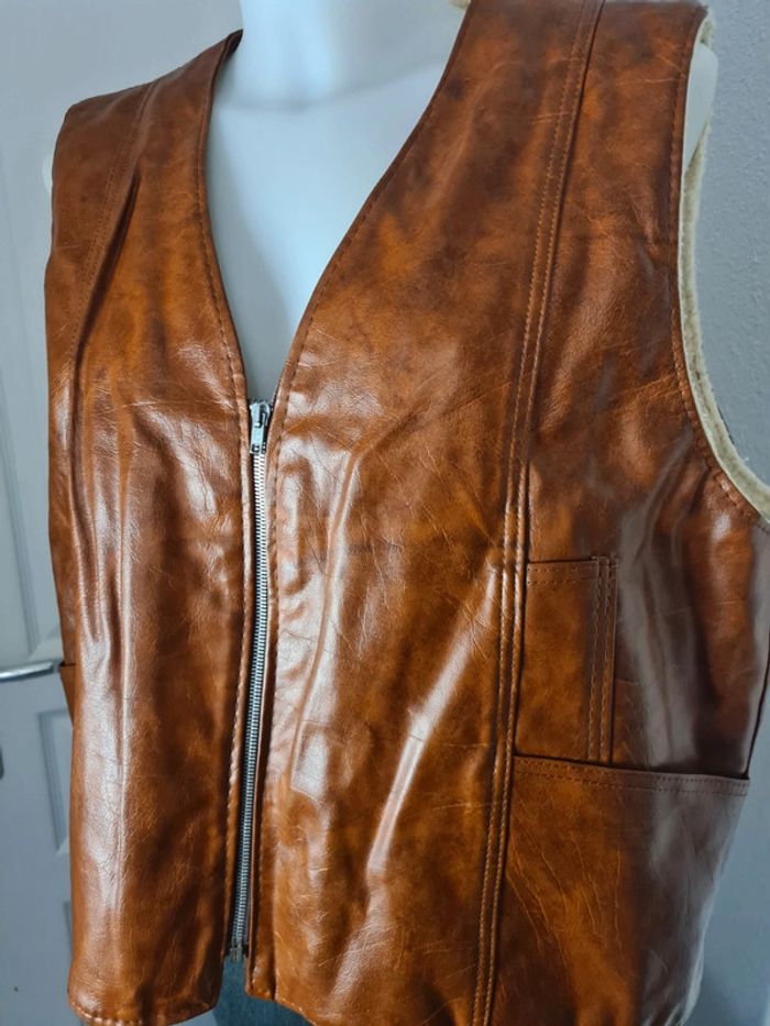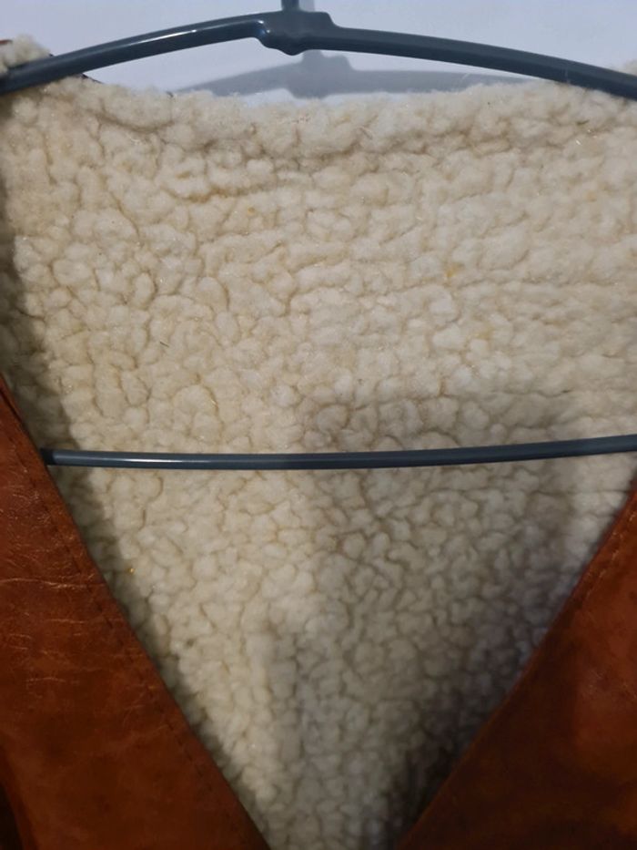 Gilet sans manches vintage cuir et laine Intérieur doublure en laine Extérieur cuir marron Fermeture Zip Coupe oversize plus long à l'arrière Modèle vintage probablement unique Mesure aisselle à aisselle 60 cm Longueur 60 cm devant et 70 cm derrière Q7