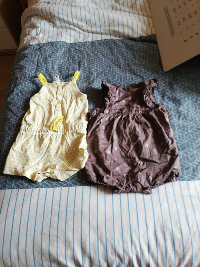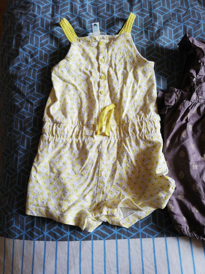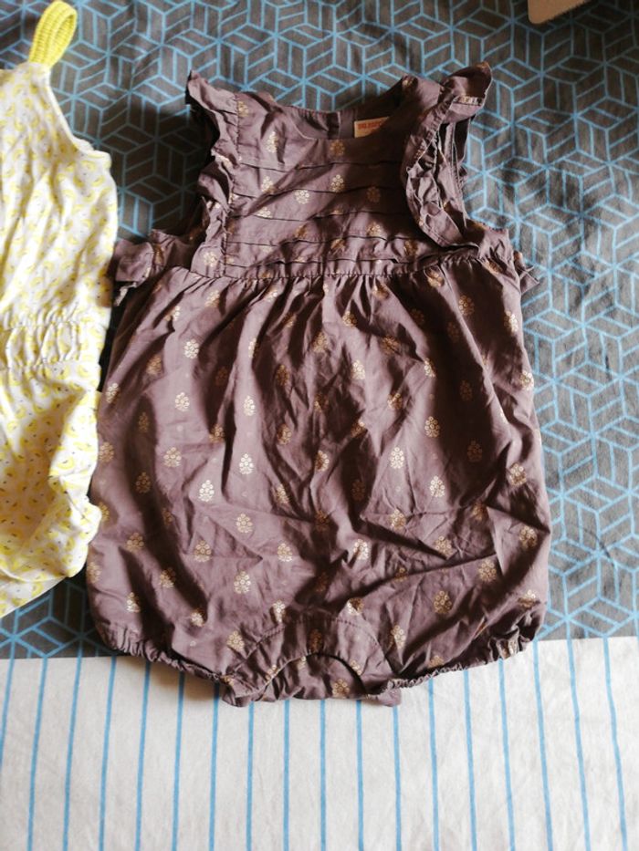 Une combinaison short blanche et jaune avec des citrons marque Obaïbi L'autre marron avec des fleurs dorées marque DPAM Taille 18 mois Très peu portées car ma fille est passée directement au 2 ans #aminata35530fille18mois