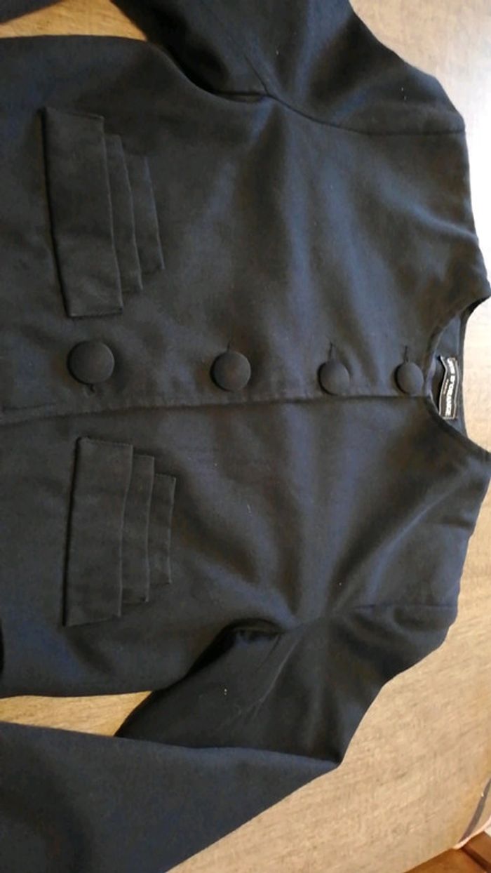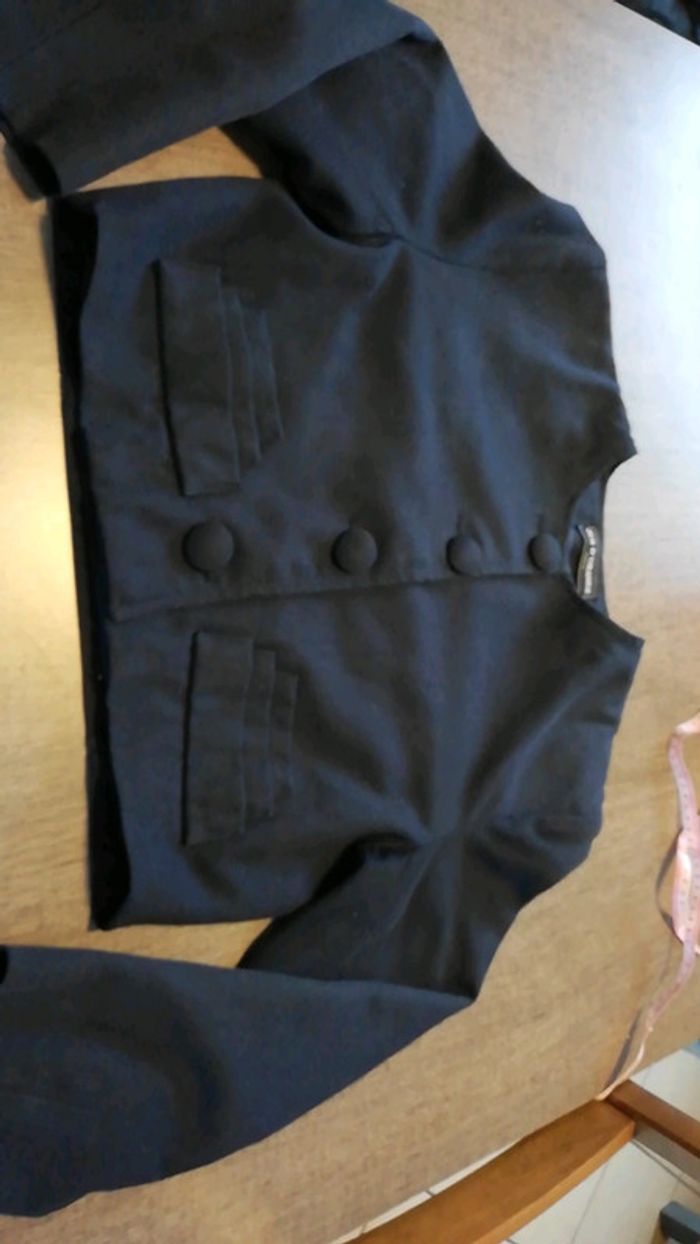 Veste bleu marine de la marque jus d'orange. Plus d'étiquette de taille, je pense que c'est un 38, voici les mesures précises: Épaules à épaules : 44 cm Épaules au bas de la veste : 42 cm Longueur de la taille sous les aisselles : 49 cm Longueur de la manche : 53 cm Veste très originale mais qui a besoin d'un passage au pressing car je ne sais pas comment la laver moi meme. Quelques taches de présentes #aminata35530femme38