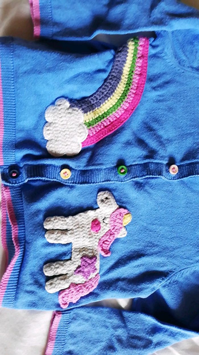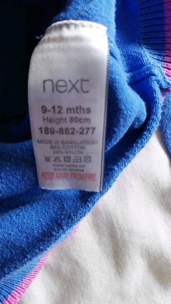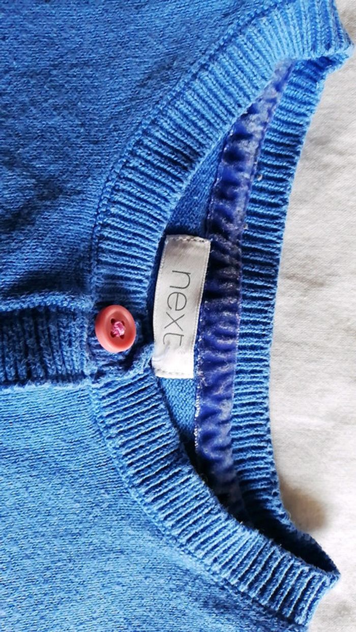 Gilet bleu en coton avec des broderie Marque Next taille 9/12 mois. Présence de quelques peluches. #aminata35530fille9mois