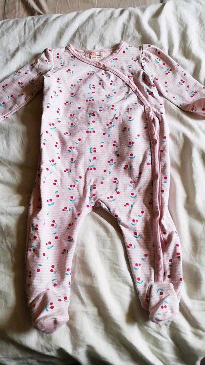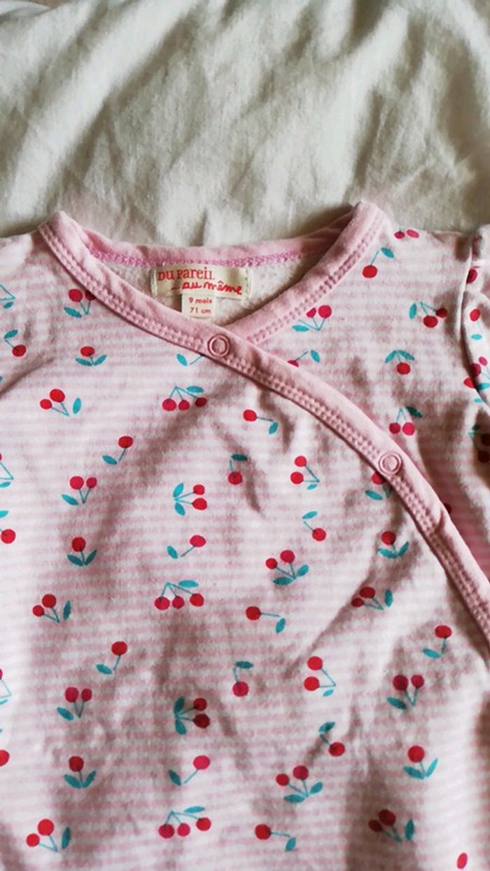 Grenouillère légère marque DPAM, taille 9 mois. Rose a rayures blanches avec des cerises #aminata35530fille9mois