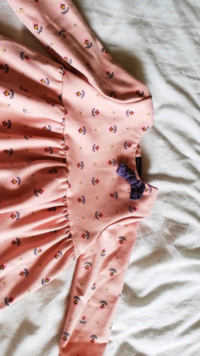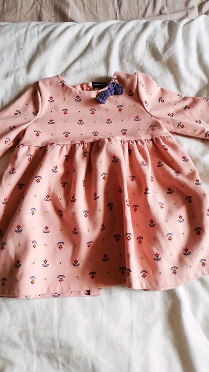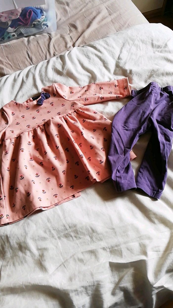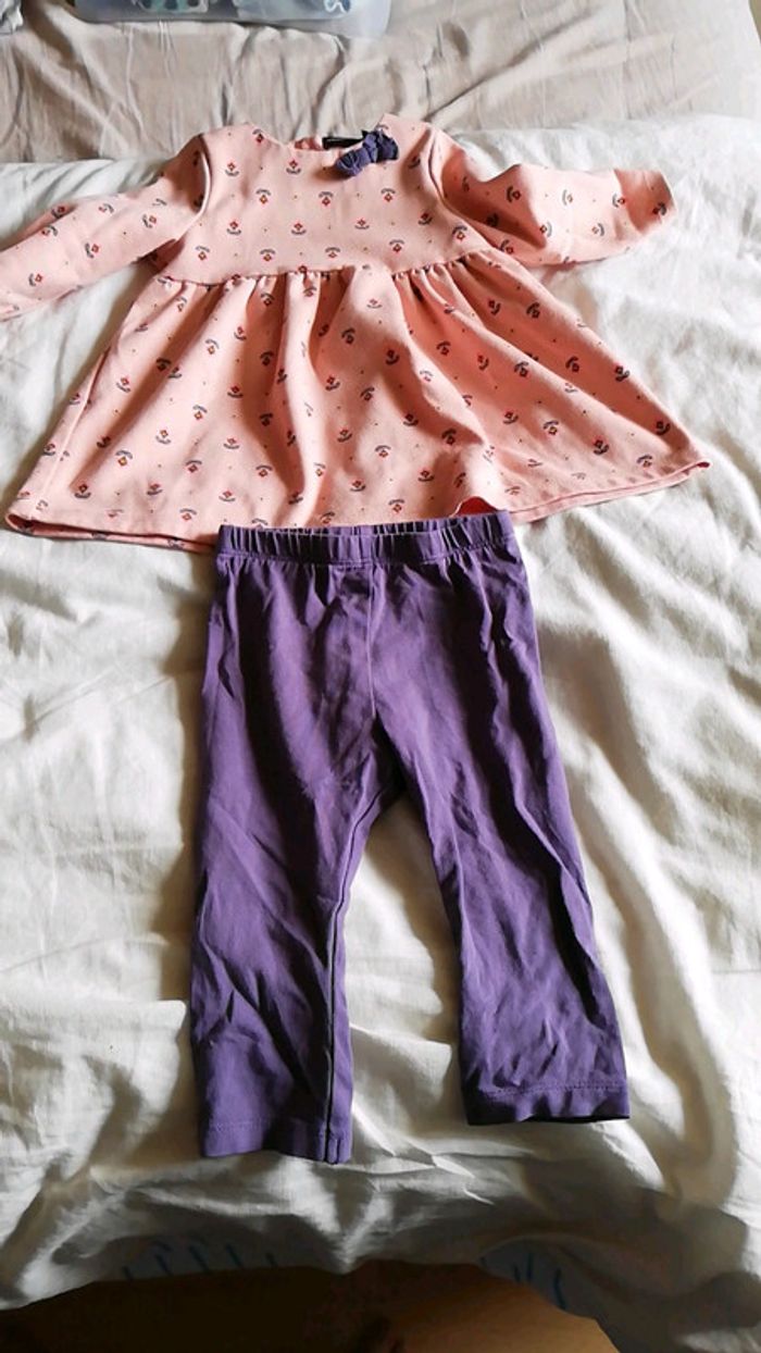 Ensemble de chez sergent major composé d'une robe couleur abricot avec des petites fleurs mauves et rose (s'oivre entièrement dans le dos) ainsi que son leggings mauve. Bien porté donc quelques bouloches dut aux lavages #aminata35530fille9mois