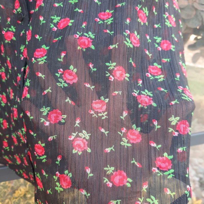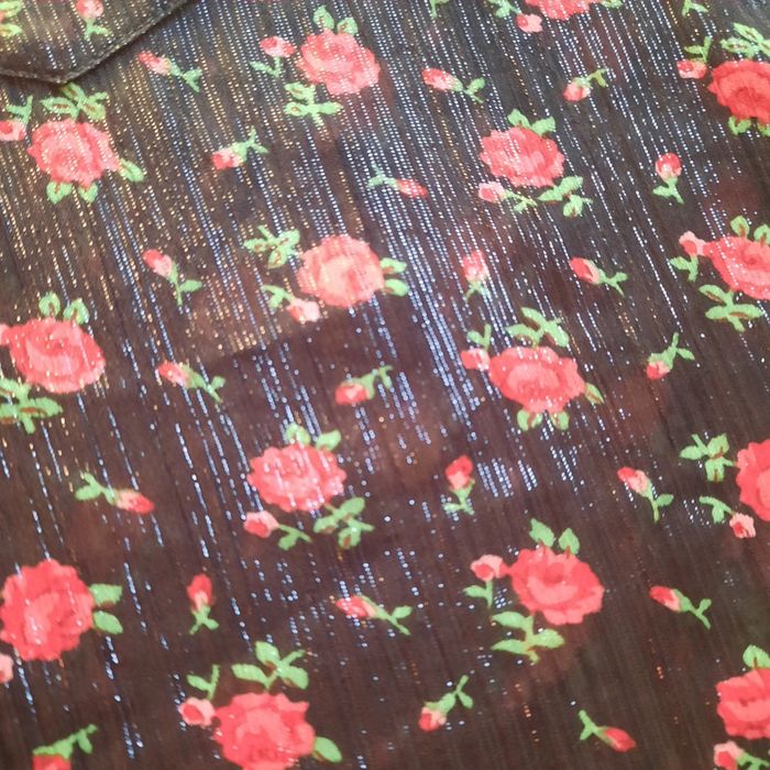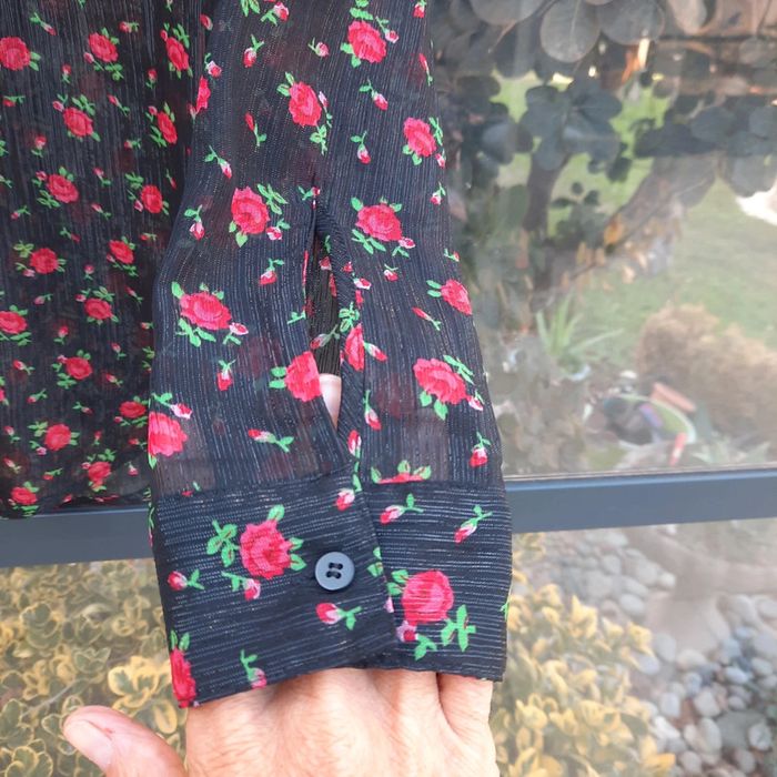 Elle est plus jolie en réel qu en photo !!!! Noire avec des roses et des petits fils argentés qui ne ressortent pas bien sur les photos. Portée pour une soirée uniquement. Comme neuve . 100 % polyester Mesures à plat Aisselles à aisselles 54 cm Longueur 70 cm N hésitez pas à visiter mon profil et laissez vous guider par mes différents # #clementine13430femmest38 #soirée #réveillon #chemisechic #chic #rouge #rougeetnoire #rougenoir #shabby #romantique