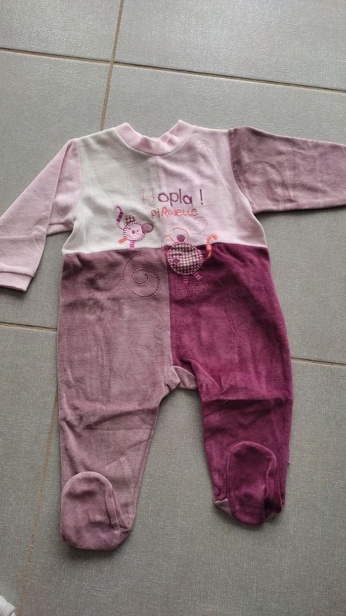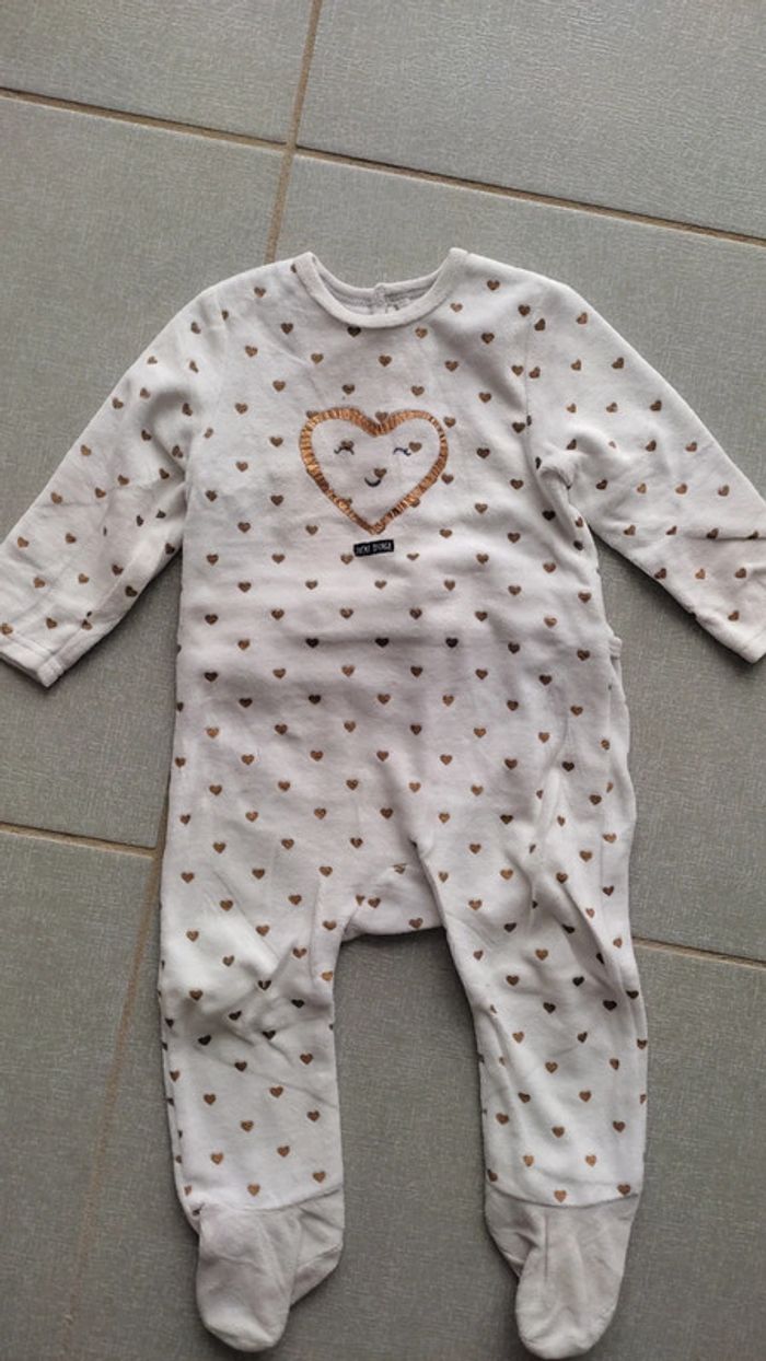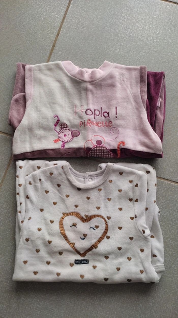 Lot de 2 pyjamas chauds composé de : • 1 pyjama blanc Sucre d'orge motif coeur doré 75% coton 25% polyester • 1 pyjama rose et violet Absorba motif souris "Hopla pirouette galipette" 77% coton 23% polyester Taille 18 mois (81 cm) Foyer non fumeur