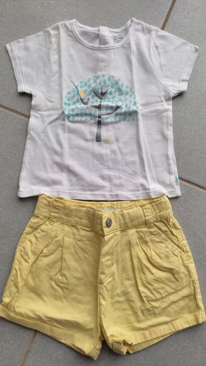 Ensemble composé de : • t-shirt manches courtes avec impression arbre 100% coton. Boutons pression à l'arrière • short avec taille ajustable Taille 18 mois (80 cm) Foyer non fumeur