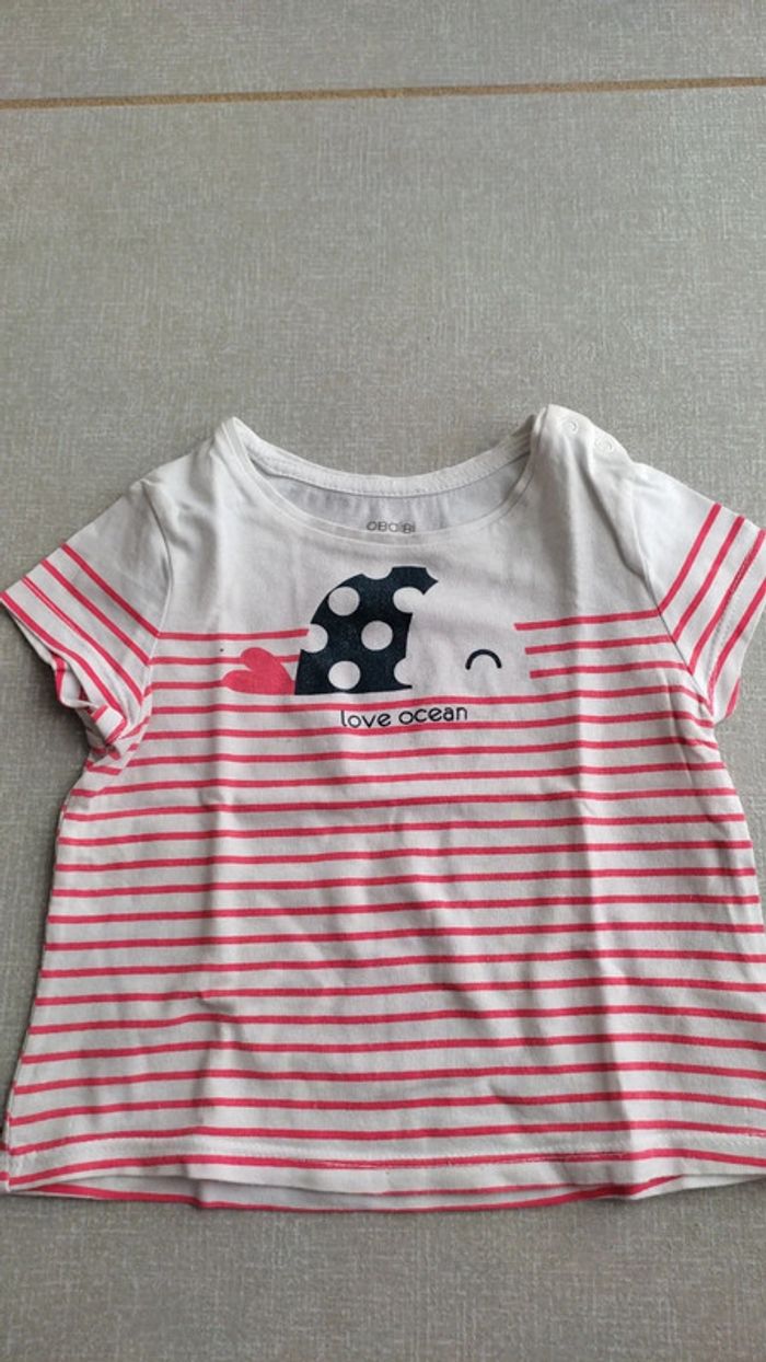 Ensemble composé de : • t-shirt manches courtes Obaibi 100% coton motif poisson "love ocean" . Boutons pression à l'épaule. 12 mois (74 cm) • pantalon Zeeman avec fausses poches 60% coton 38% polyester 2% elasthane. 12 mois (80 cm) Foyer non fumeur