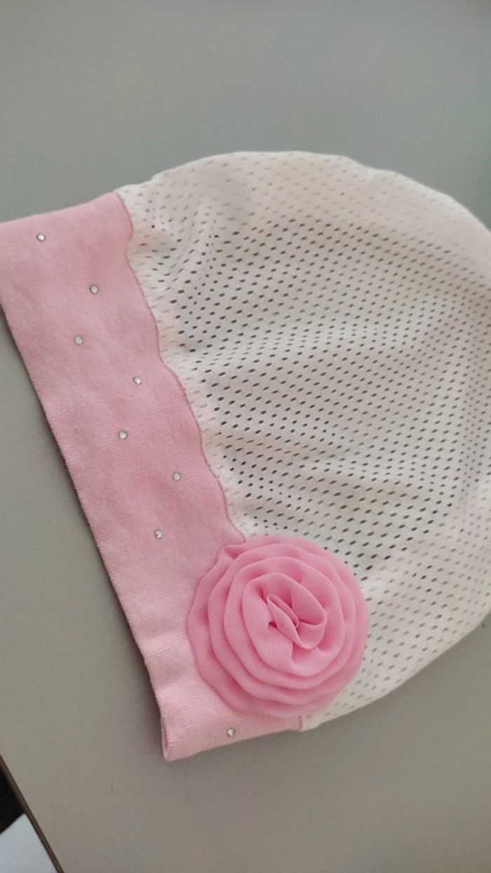 Bandana blanc et rose avec une fleur rose et de petits diamants Taille 44-48 cm 100% coton Étiquette coupée mais jamais porté Foyer non fumeur