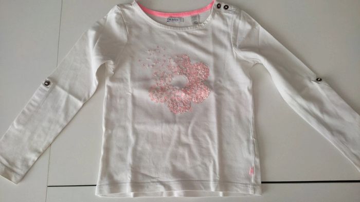 T-shirt manches longues, retroussables en manches 3/4 par bouton (voir photo) Motif fleurs en sequins Le bout des manches n'est plus d'un blanc éclatant (voir photo) 100% coton Foyer non fumeur