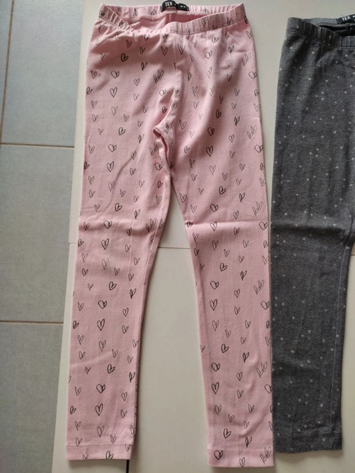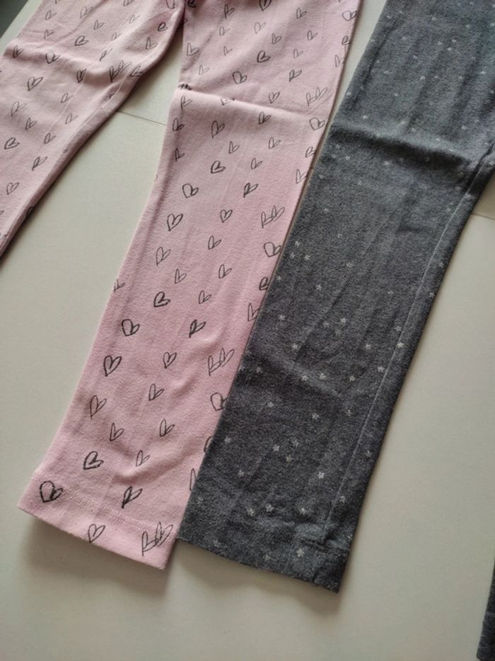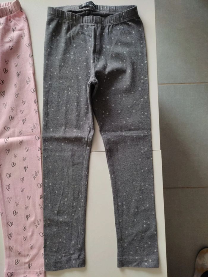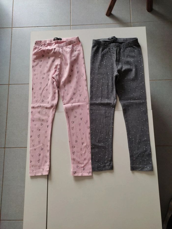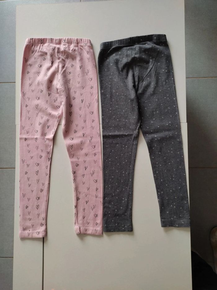 Lot de 2 leggings : • 1 rose motif coeurs gris • 1 gris motif étoiles argentées Portés plusieurs fois mais pas de tâche ni de trou Foyer non fumeur