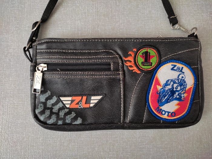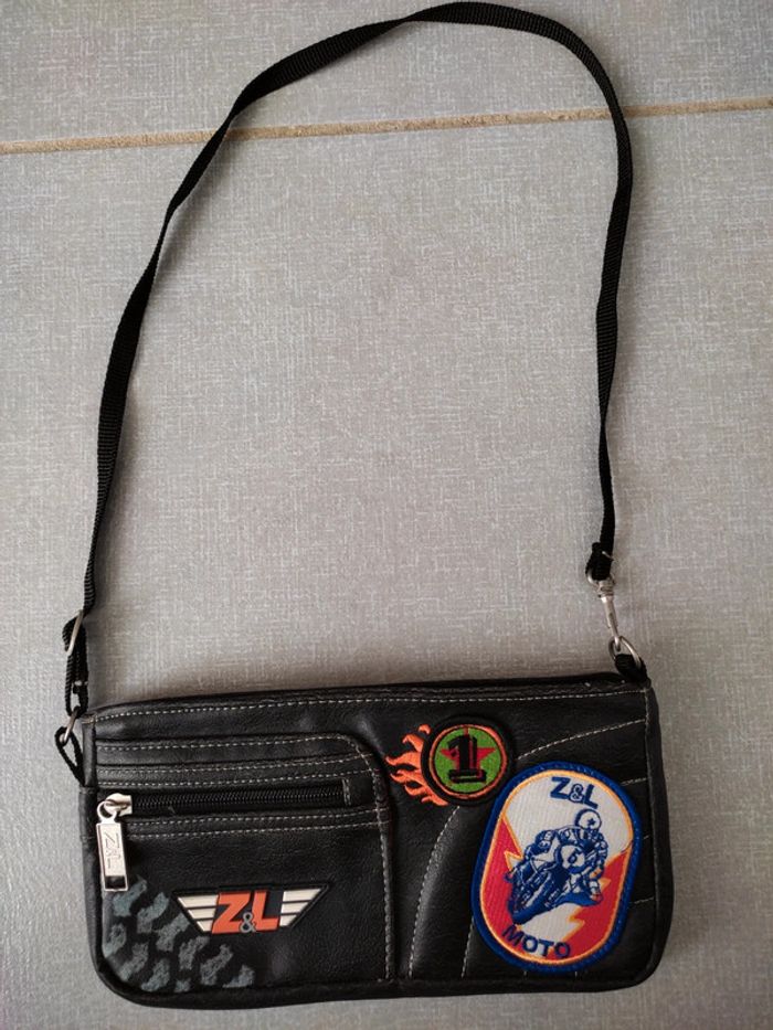 Sac bandoulière Z&L moto Extérieur polyuréthane intérieur nylon Fermeture par zip 24 cm x 13 cm. Hauteur anses 36 cm Neuf Foyer non fumeur