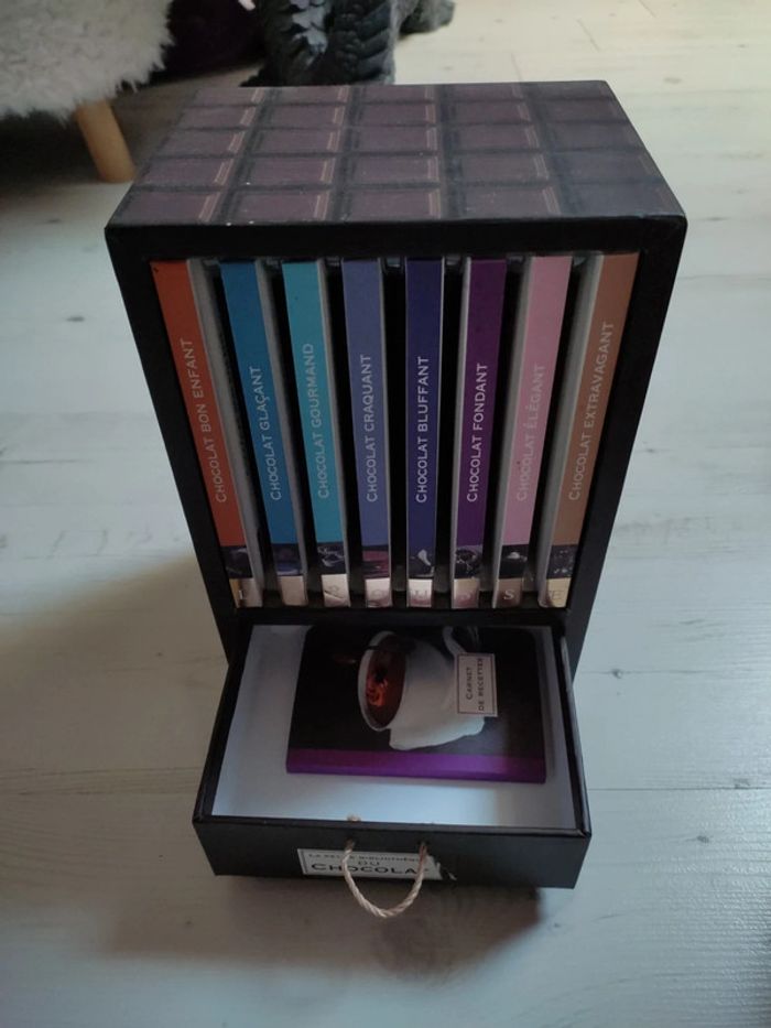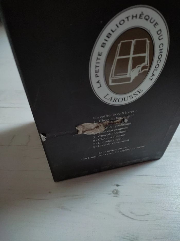 Coffret de recettes au chocolat édition Larousse Avec 8 livres + 1 carnet de recettes à compléter soi-même Arrière du coffret abîmé, livres en parfait état, carnet de recettes neuf