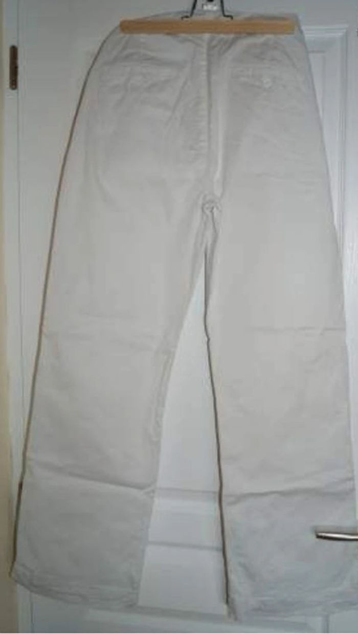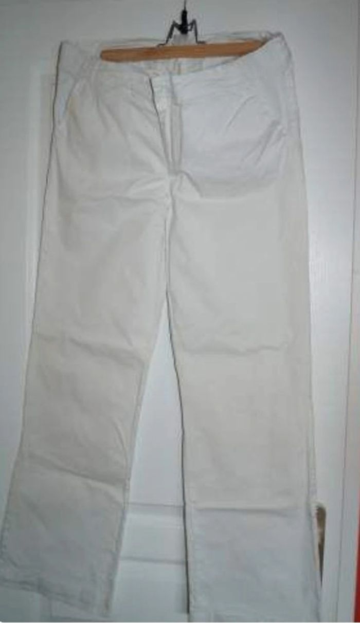 pantalon en toile blanc, taille 40 , parfait pour la mi-saison et l'été, tissu super agréable, le pantalon se place sous le ventre et s'adapte grâce à un tissu extensible au niveau des poches, il n'y a pas de bandeau qui recouvre le ventre ou à régler. marque colline État neuf. #mavericmaternité