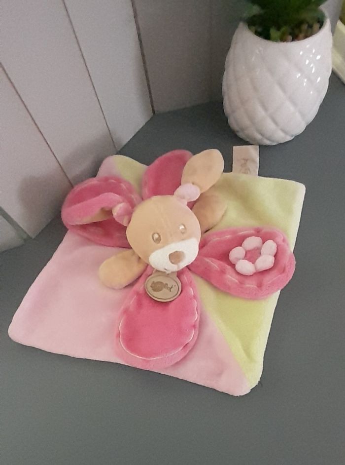 Doudou semi-plat lapin Mila, collection Milo et Mila, rose et vert pastel, pétales et fleur, tbe (juste lavé), en velours tout doux