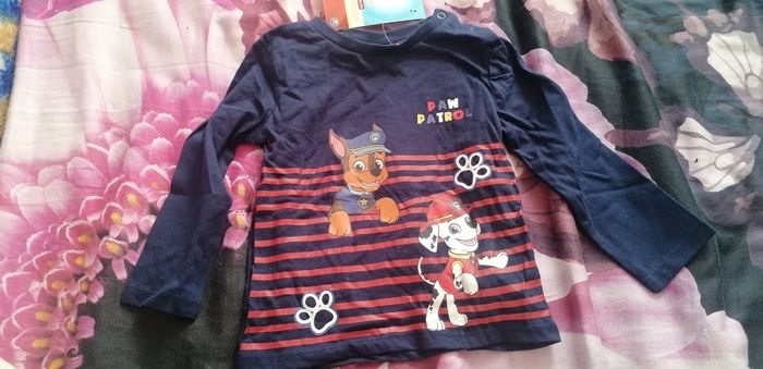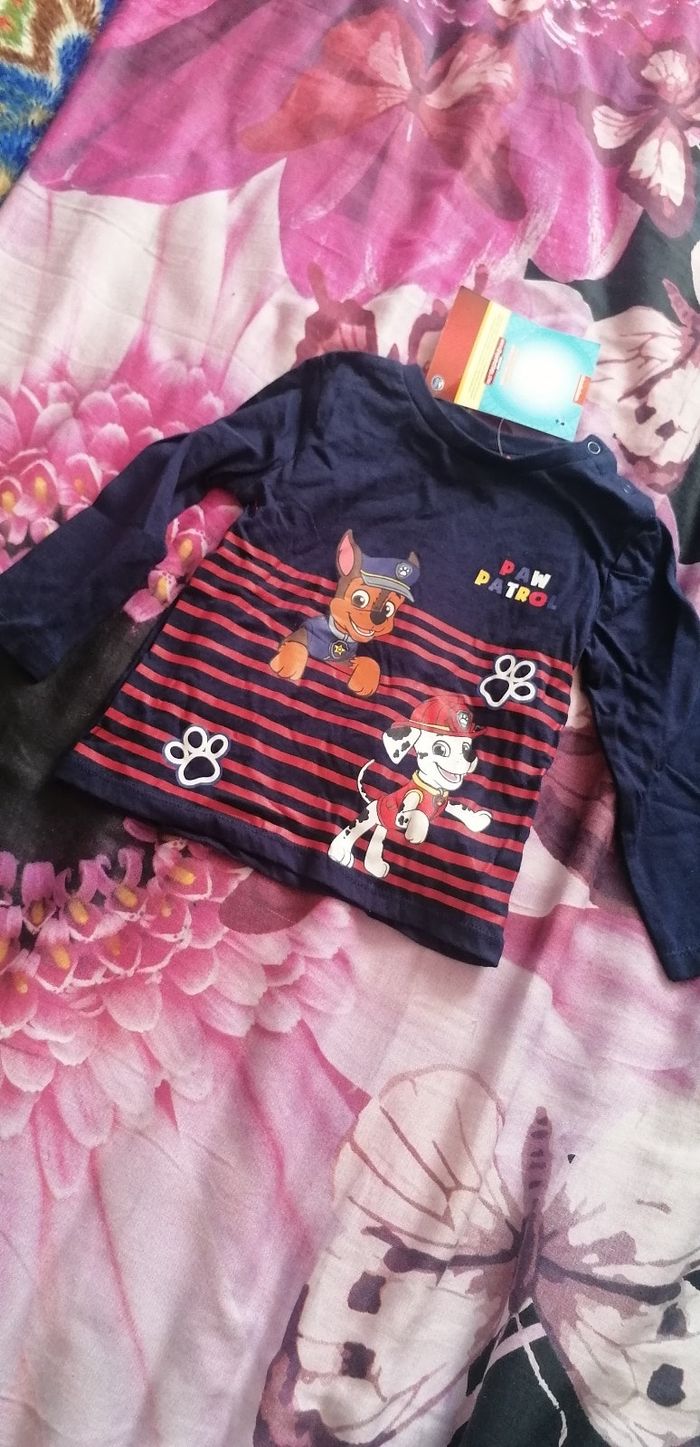 T-shirt manches longues neuf et étiqueté, Pat Patrouille, taille 9 mois et un autre 12 mois. Me demander la taille avant l'achat svp, merci.