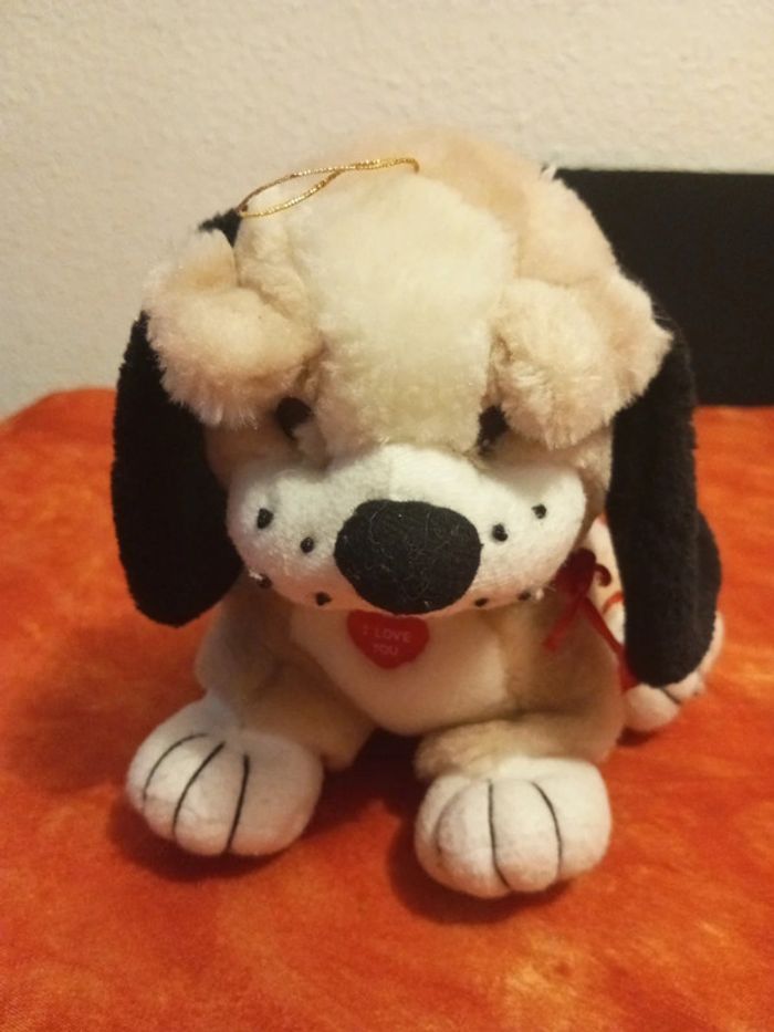🚨N'hésitez pas à me demander pour les lots, ils ne se font pas automatiquement car vendeuse pro,réduction jusqu'à 30%🚨 Peluche chien beige, oreilles noires avec chœur rouge I love you ❤️ En très bon état, vendu comme sur les différentes photos. Dans mon dressing, il y a d'autres super héros, des poupées Ever After high, des Petshop, des Lego Duplo, des Playmobil, des Barbie et beaucoup de peluches, jeux et jouets vintage