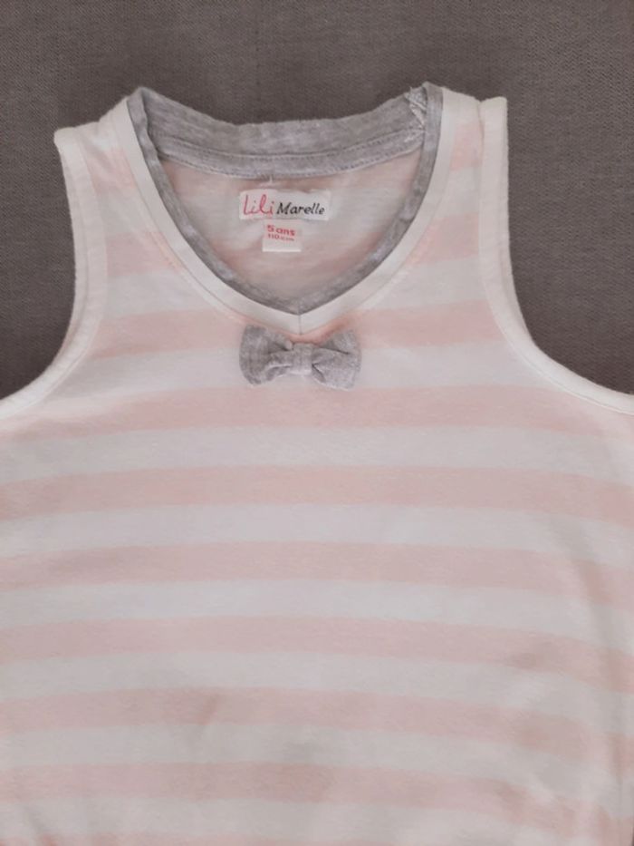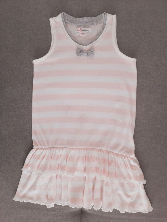 Robe Lili Marelle 5 ans Rayée blanc et rose clair Haut de la robe forme débardeur Petit noeud gris clair décoratif Bas de la robe volanté Jersey de coton stretch Très bon état #adelaide7624vetementsfille5ans