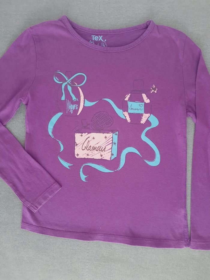 T-shirt manches longues 5 ans Tex Violet Motifs bouteilles de parfum et rubans bleu turquoise et rose clair 100% coton Très bon état #adelaide7624vetementsfille5ans