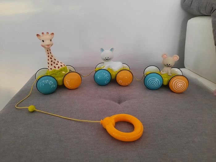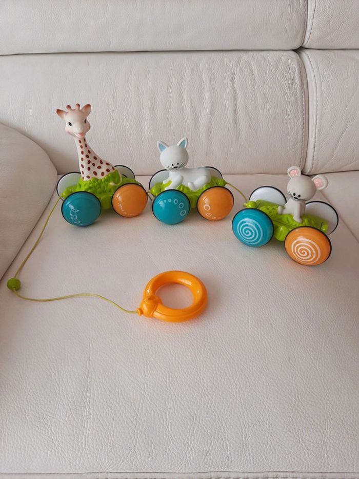 Jouet 1er âge à tirer Sophie La Girafe et ses amis Très bon état mais Sophie a perdu un peu de couleur sur ses oreilles Comprend 3 personnages : - Sophie la girafe qui fait un joli son de grelot - Lazare le chat qui bouge lorsque l'on tire Le jouet - Joséphine la souris qui se dandine Les 3 wagons sont détachables et peuvent être utilisés séparément, ou être assemblés dans n'importe quel ordre Poignée ergonomique et amovible qui facilite la prise en main pour bébé #adelaide7624jouets