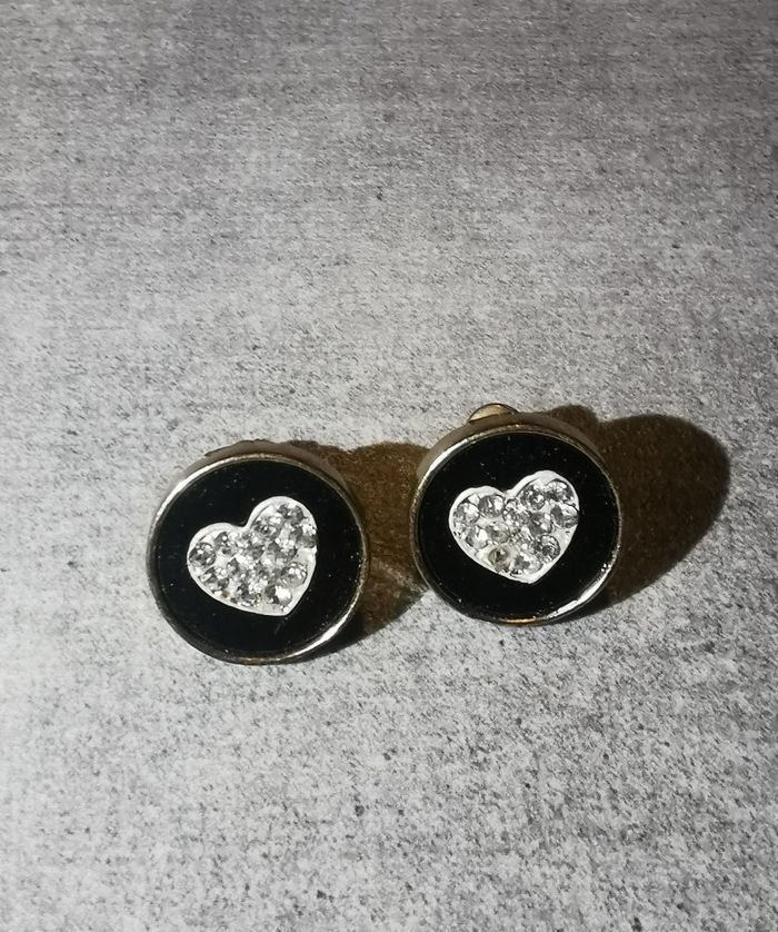 Boucles d'oreilles cœur en strass blancs et fond noir jamais portées avec