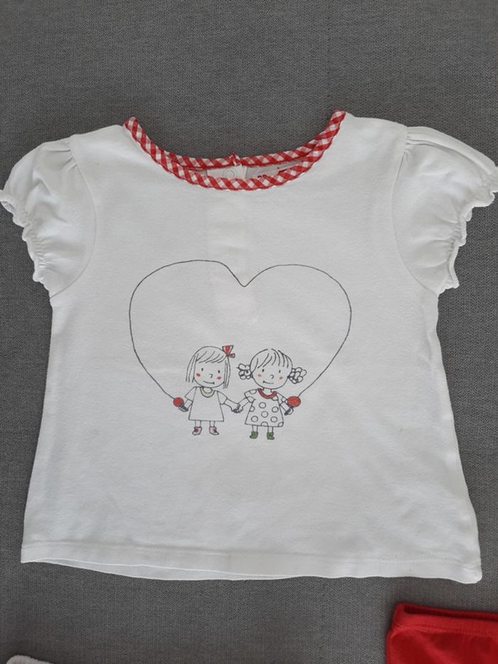 Ensemble 3 pièces 12 mois Du Pareil Au Même : T-shirt manches courtes blanc motif petits filles dans un cœur, liseret à carreaux blanc et rouge au col Legging rouge long Short bouffant en coton stretch blanc Très bon état #adelaide7624vetementsfille12mois