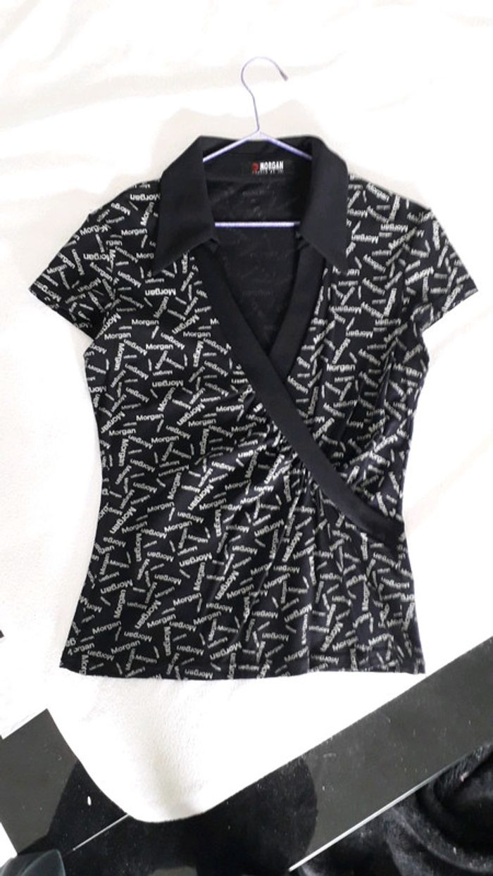Chemisier à manches courtes Morgan noir avec inscriptions blanches taille 36 stretch - photo numéro 1