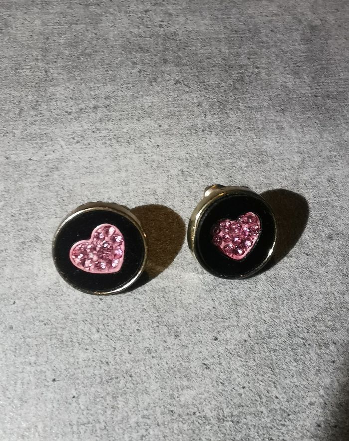 Boucles d'oreilles cœur en strass roses et fond noir jamais portées avec