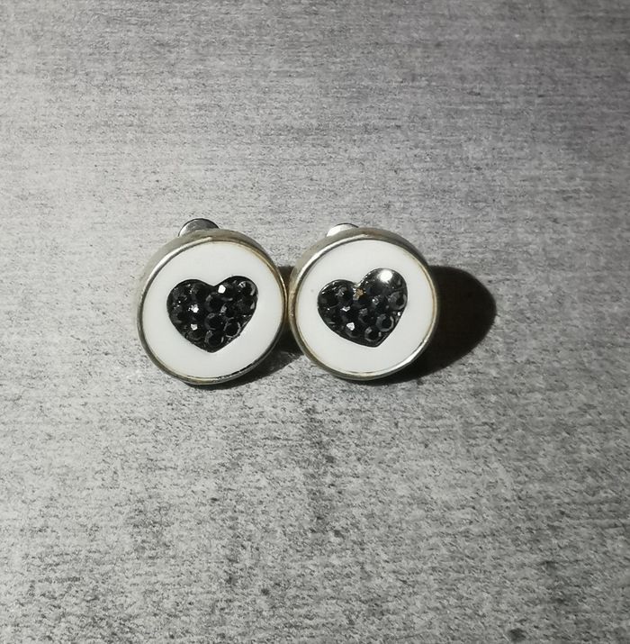 Boucles d'oreilles cœur en strass noirs et fond blanc jamais portées avec