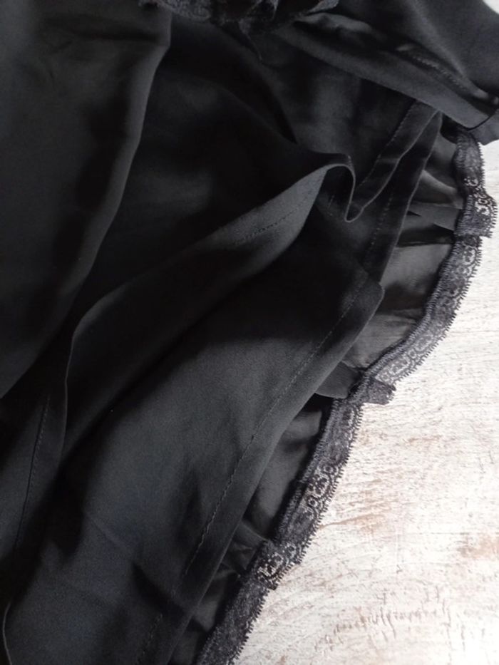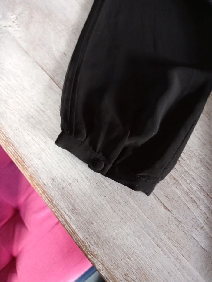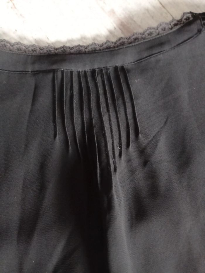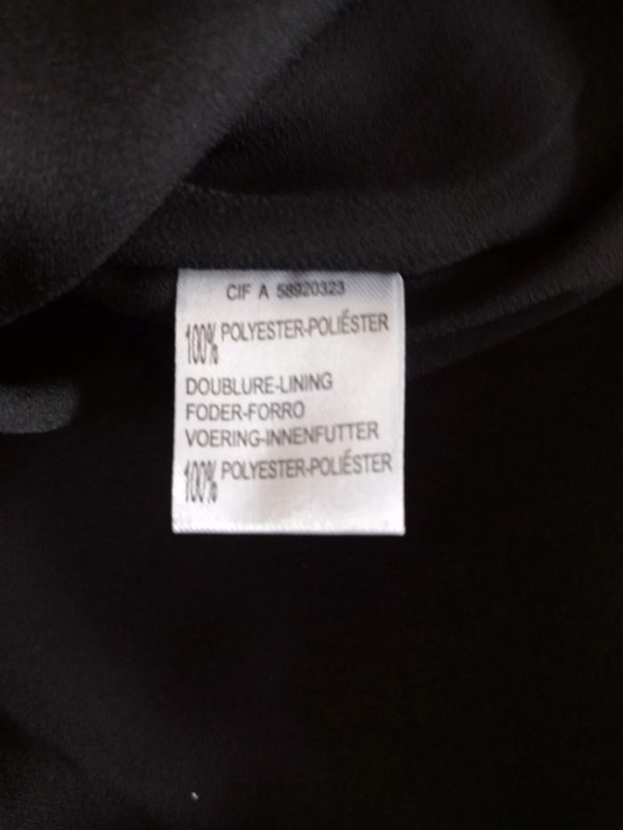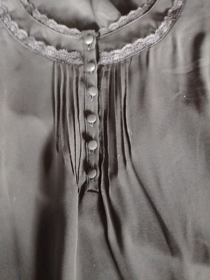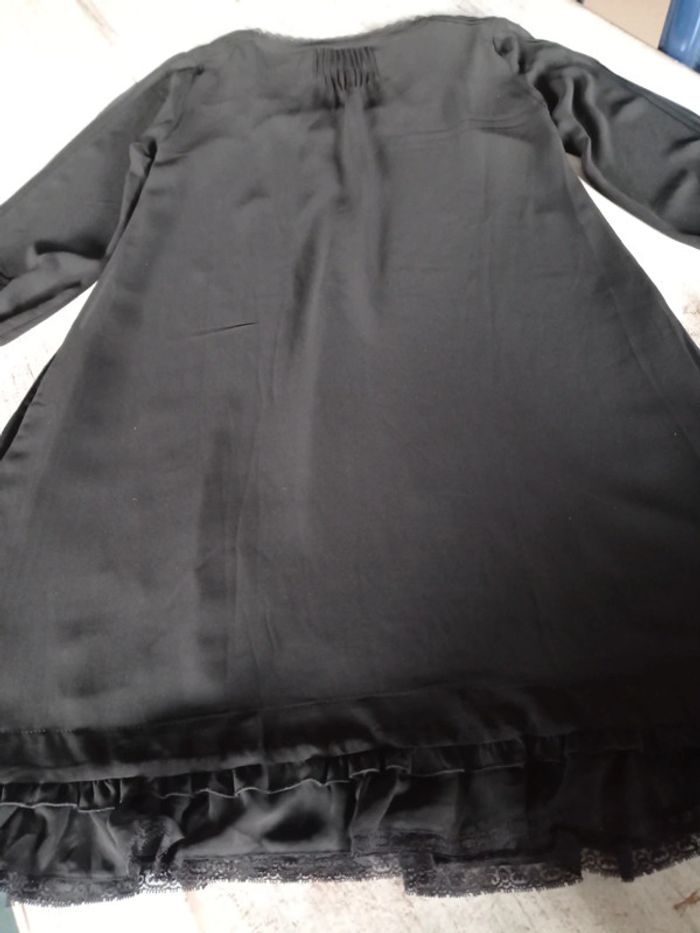 Très peu portée Très bon état 2 poches côtés Longueur dos 86 cm Largeur sous bras 40 cm Épaules 36 cm Coupe trapèze Petits plis manches épaules et dos Plastron devant boutonné Doublée Manches transparentes légèrement Dentelle encolure et bas 100% polyester
