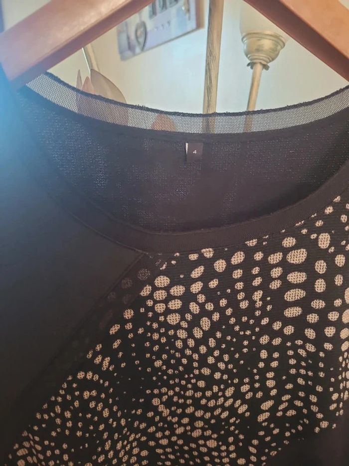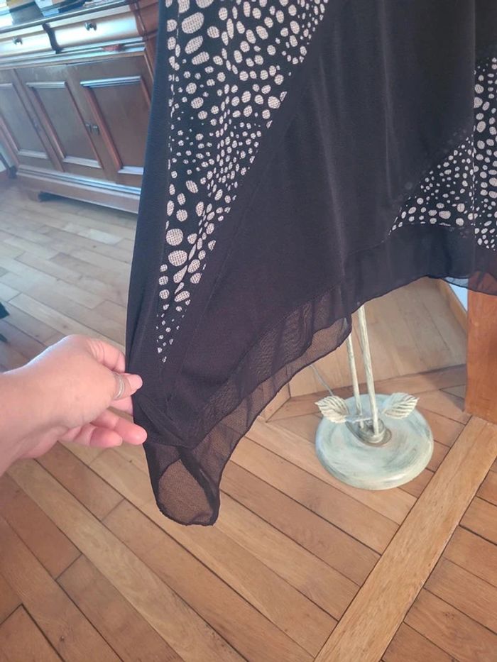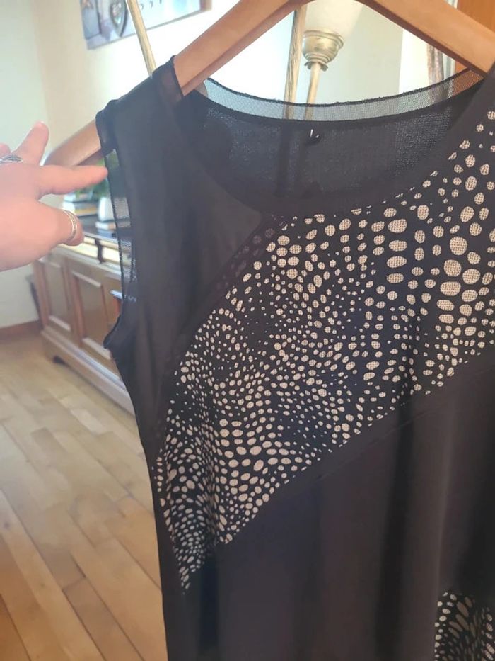 ⬇️mes autres annonces pour femme en taille 40 👉 #cg89femme40 😁 réductions activées des 2 articles ! un tshirt ou une tunique sans manche de couleur noir avec motif à pois en biais. Elle est originale avec les pointes sur le coté. Elle mesure 50 cm aisselles à aisselles et 74 cm longueur Elle est extensible et elle n'a pas besoin de repassage. Très bon état #tunique #taille40 #tshirt
