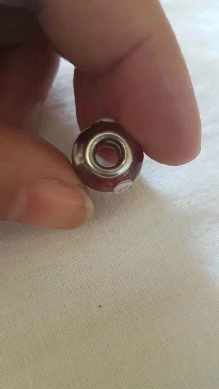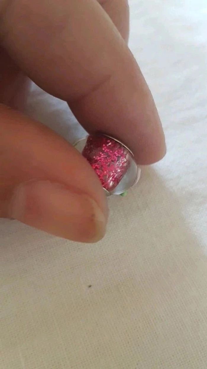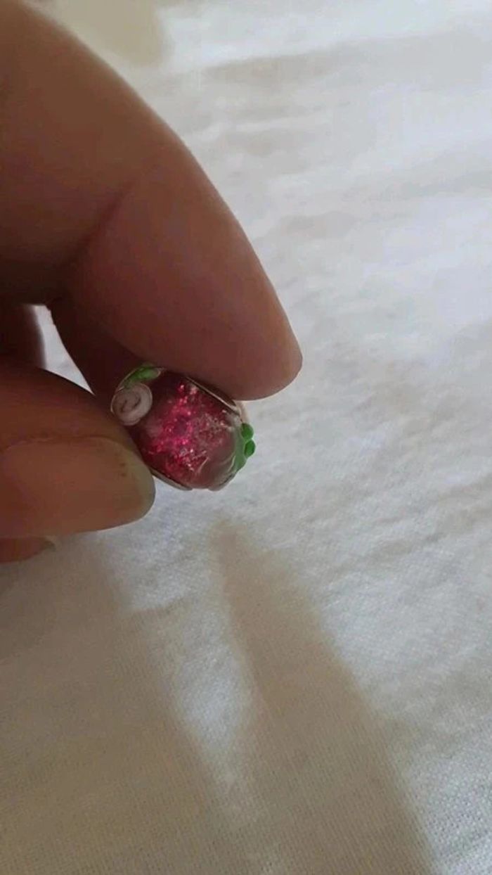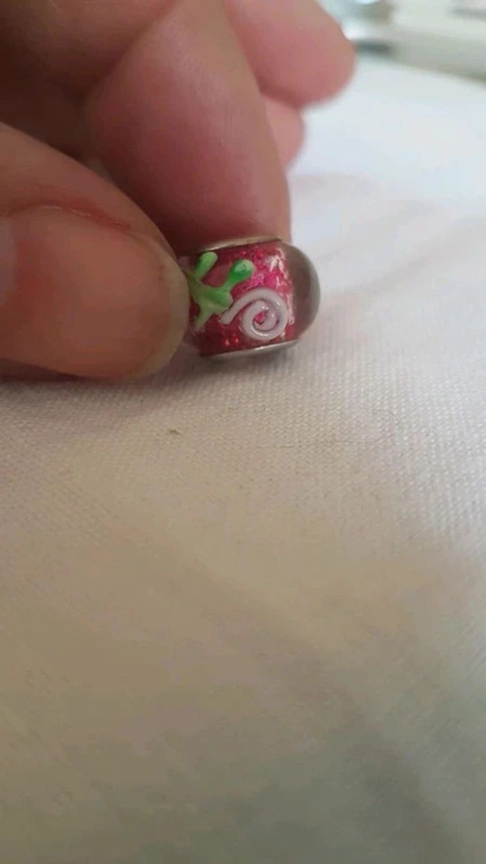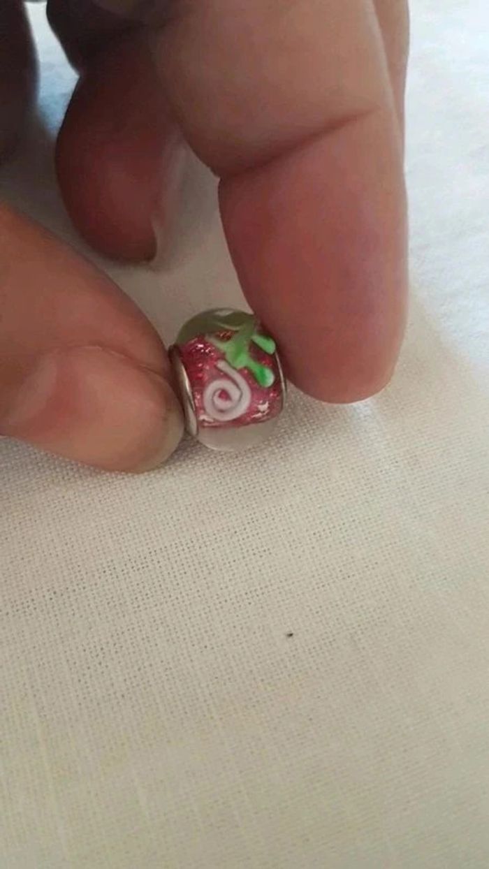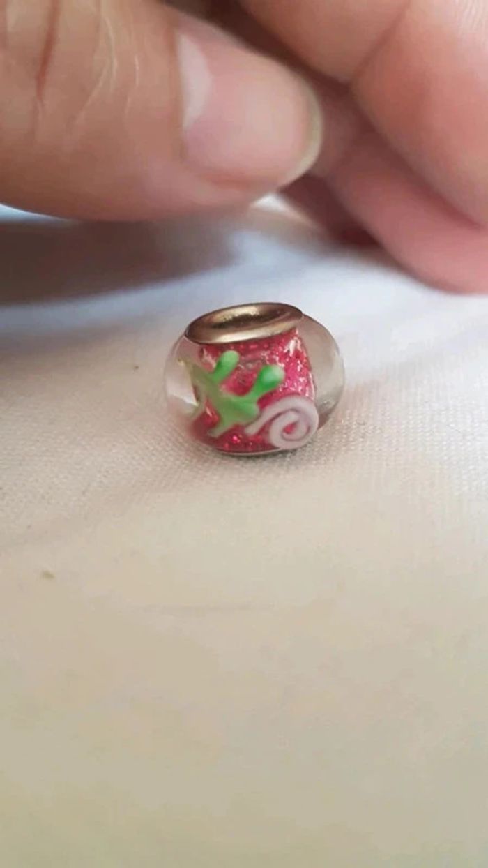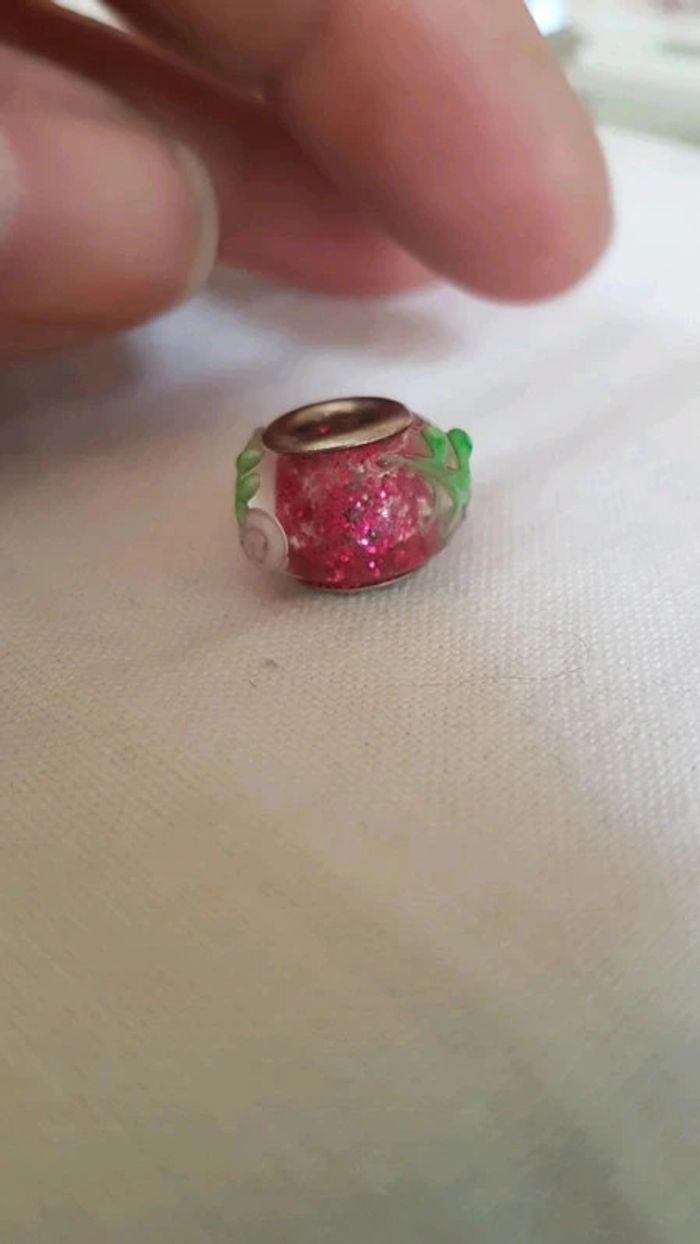 jolie perle de verre rose pailleté et une rose dessinée en relief, à mettre sur un bracelet ou collier pandora.
